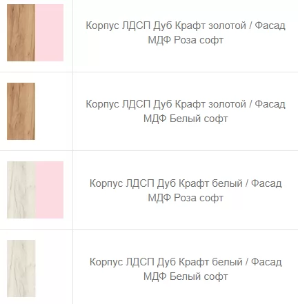| Цвет(корпус/фасад) | Дуб крафт золотой/Фисташка софт, Дуб крафт золотой/Белый софт, Дуб крафт золотой/Ниагара софт, Дуб крафт золотой/Роза софт, Дуб крафт белый/Роза софт, Дуб крафт белый/Ниагара софт, Дуб крафт белый/Белый софт, Дуб крафт белый/Фисташка софт |
