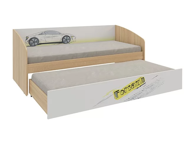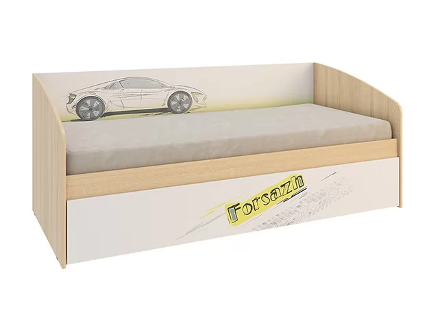 Кровать «Форсаж» выполнена в светлых оттенках: сочетании белого и дуба сонома, декорирована принтом автомобиля на фасаде спинки и надписью на фасаде выдвижного ящика. У кровати «Форсаж» удобное, эргономичное основание, комфортабельное спальное место. Вместительный нижний выдвижной ящик позволяет разместить в нем все необходимое постельное белье, одеяло, подушки, что существенно экономит место в комнате и шкафах, помогает поддерживать порядок в комнате. Кровать «Форсаж» в {{in_city}} является элементом одноименной модульной детской, может использоваться и в ее составе, и в качестве самостоятельного предмета мебели.