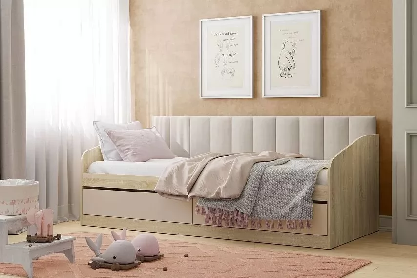 Одноместная кровать Акварель 41.50 с лаконичным дизайном идеально подходит для оформления уютного спального уголка в детской. Вместительные бельевые ящики удобны для хранения постельных принадлежностей. Боковая спинка предотвращает истирание настенного покрытия. Кровать полностью безопасна для ребенка: у модели нет острых углов и накладных ручек на фасадах ящиков. Ограждение защитит ребенка во время сна, а мягкий элемент сделает чтение книги или отдых на кровати более комфортным.