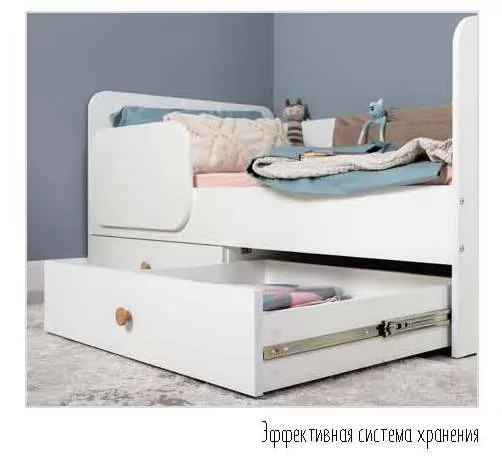 Джастин уникален тем, что подходит для разных возрастных категорий: для малышей – кроватка с защитным бортиком, съемными тканевыми кармашками и выкатными ящиками; для подростков – кровать с полноценным спальным местом и нишей для книг в изголовье; всевозможные модули для хранения. А в ящик письменного стола можно спрятать под замочек свои сокровища и секреты.