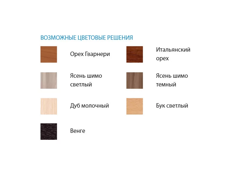 | Цвет | Бук светлый, Итальянский орех, Вишня оксфорд, Дуб молочный, Венге, Ясень шимо темный, Ясень шимо светлый |