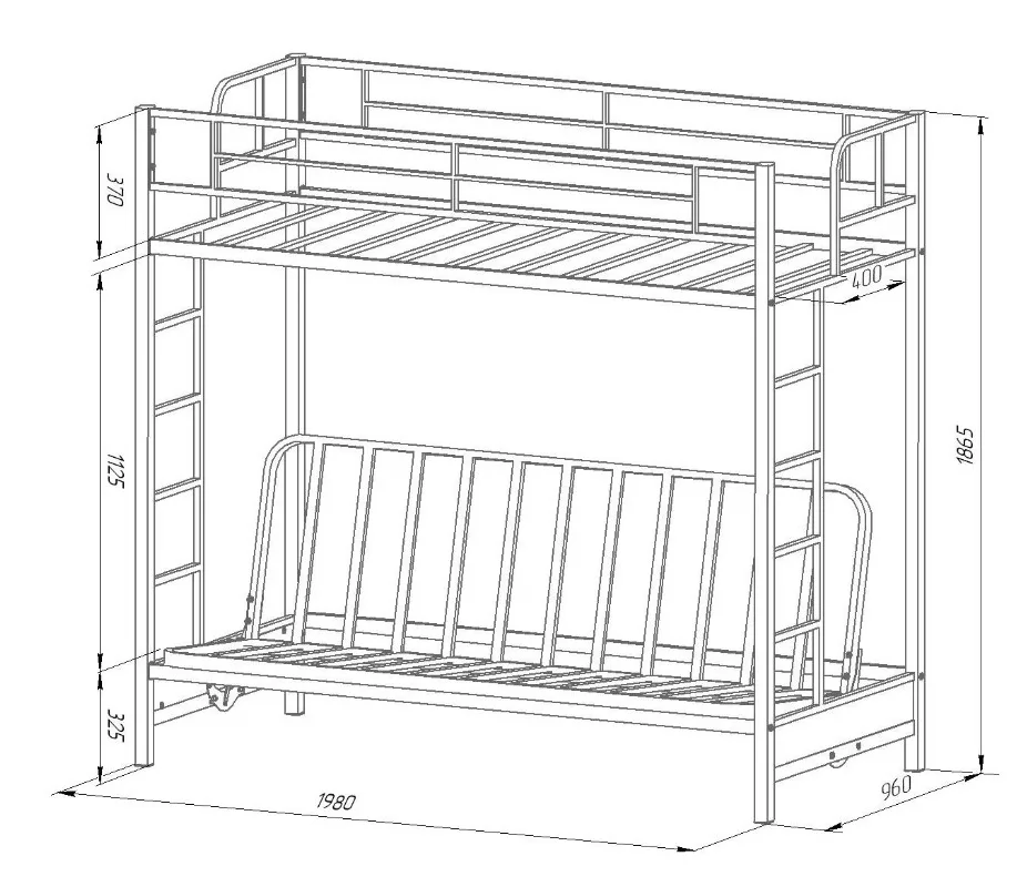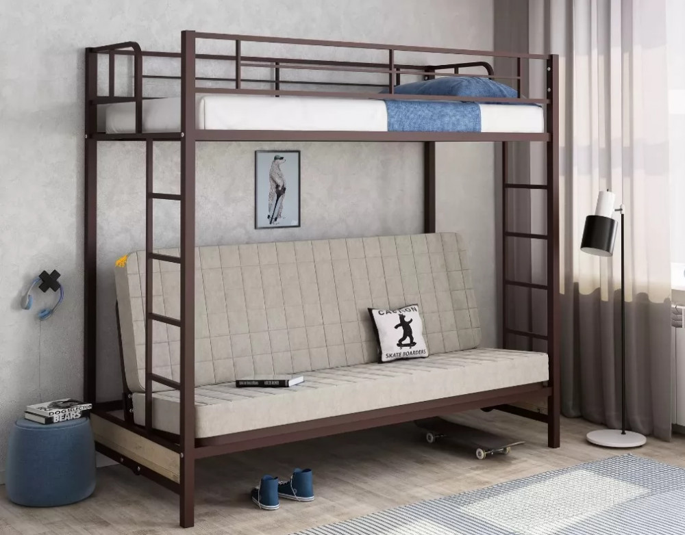 Металлическая двухъярусная кровать с диваном "Мадлен" может использоваться в спальне подростков и взрослых. Верхний ярус имеет спальное место размером 90*190 см и защищен прочными бортиками. Нижний ярус представлен раскладным диваном со спальнымм местом размером 120*190 см. Все металлические элементы кровати покрыты износоустойчивой полимерной порошковой краской без запаха.