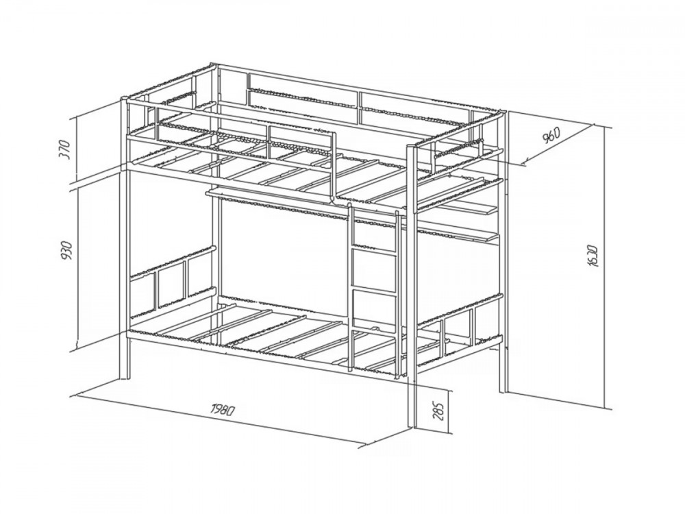 Материал каркаса: стальная труба размером 40*40 мм, 40*20 мм. Все металлические элементы кровати покрыты износоустойчивой полимерной порошковой краской без запаха. Полка изготавливается из ЛДСП, цвета: Венге, Дуб молочный.