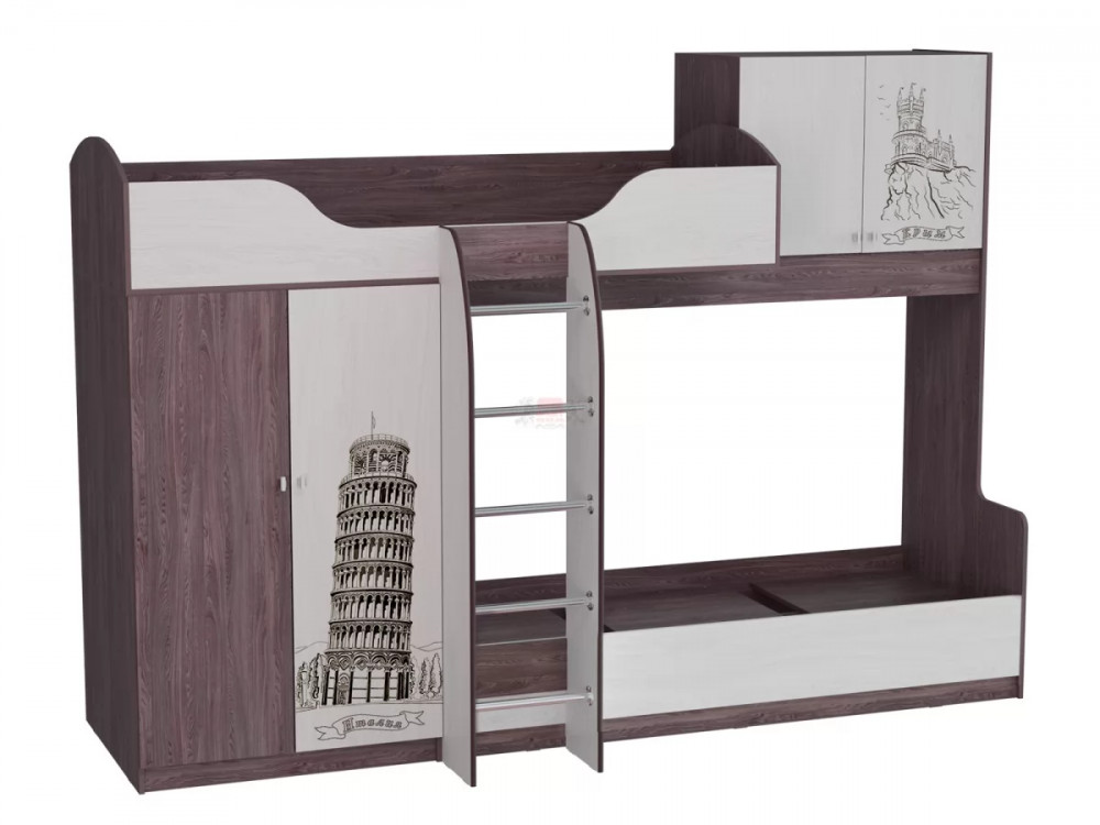 У этой модели есть два спальных места для детей до 10 лет, широкий шкаф для белья, вещей и коробок с обувью, а также верхний отсек с полками, где можно хранить книги и т.п.