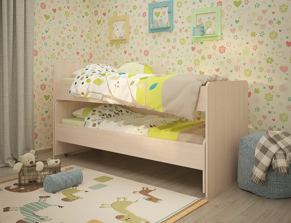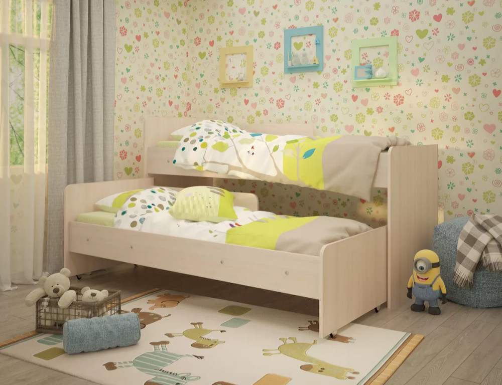 Выкатная двухъярусная кровать «Радуга», которая занимает минимум полезной площади. Экономия пространства в комнате — является главным преимуществом такой конструкции, где есть двое детей.