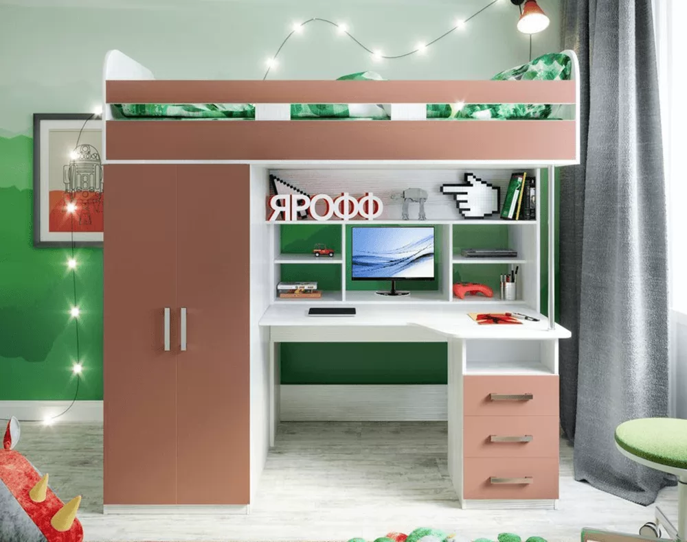 Кроме того, в кровати-чердак «Аракс» предусмотрено два шкафа: двухстворчатый на фасадной части, и шкаф-пенал – с торцевой. В первом можно развешивать одежду на плечиках, как как внутри имеется специальная штанга, а во второй удобно складывать вещи на полки. Также в конструкцию модели входит стол для учебы, на котором свободно размещается ноутбук или даже компьютер, тумба с выдвижными ящиками для учебных принадлежностей и канцелярии, несколько открытых полок над столом.