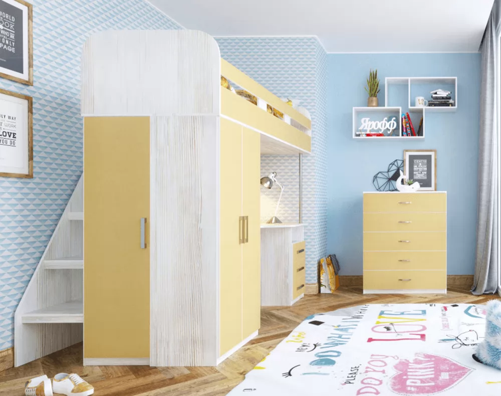 Кровать-чердак «Аракс» - оптимальный выбор мебели для детской комнаты, которая позволит на небольшой площади обустроить сразу несколько функциональных зон: спальное место, место для одежды и других вещей, а также рабочую зону. В конструкции модели предусмотрена комфортная кровать на верхнем ярусе с довольно высокими бортиками по периметру, что гарантирует безопасность вашего ребенка во время сна, даже если он очень активно двигается, когда спит. При этом, кроватка универсальная и собрать ее можно на любую сторону, а значит, поставить ее можно в любом месте в комнате.