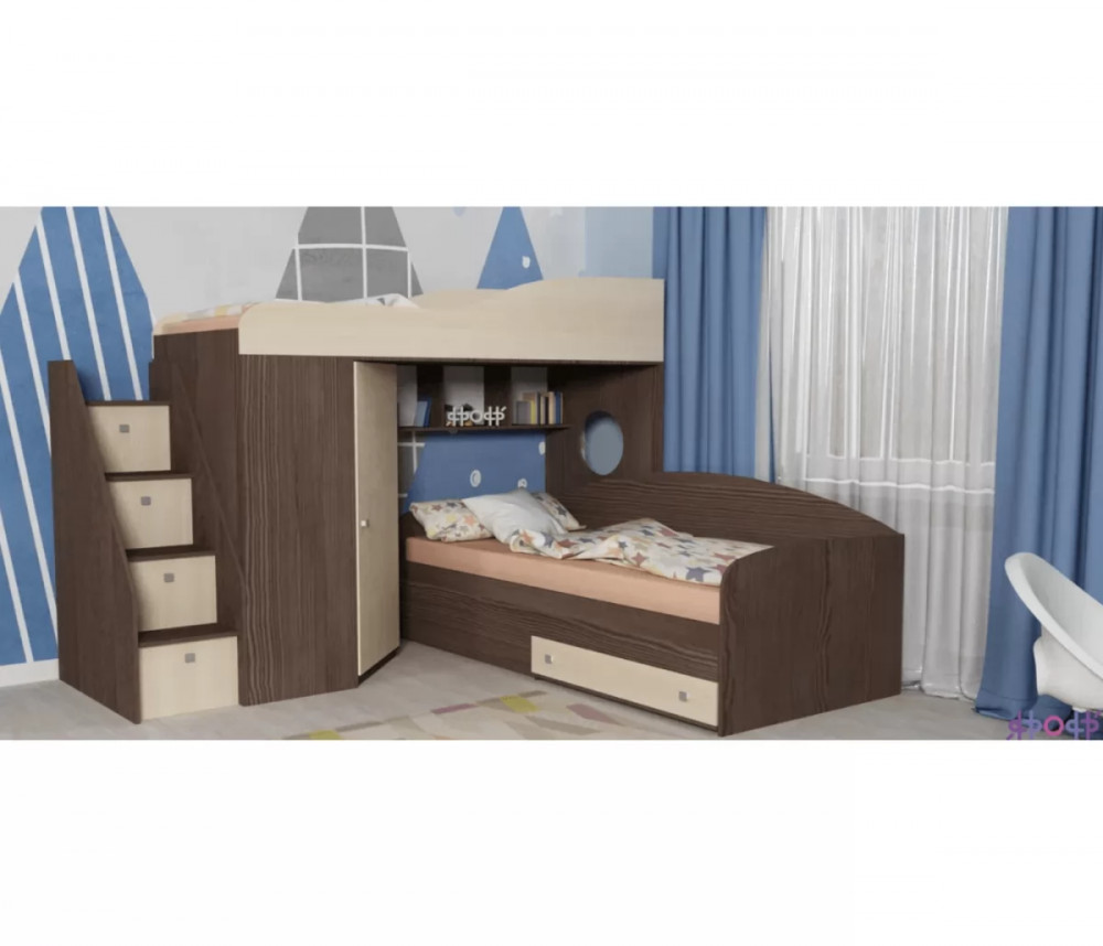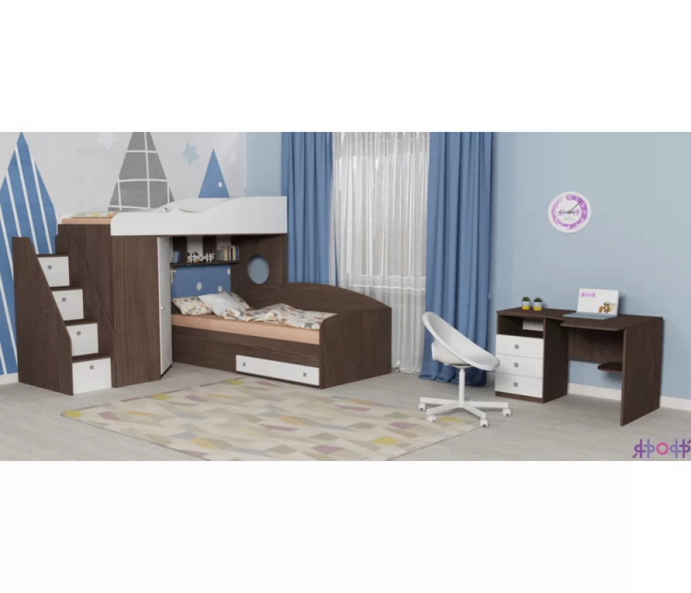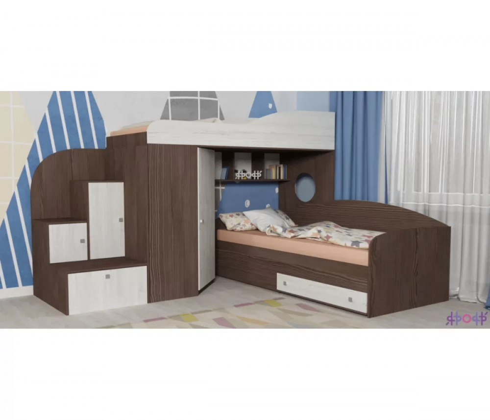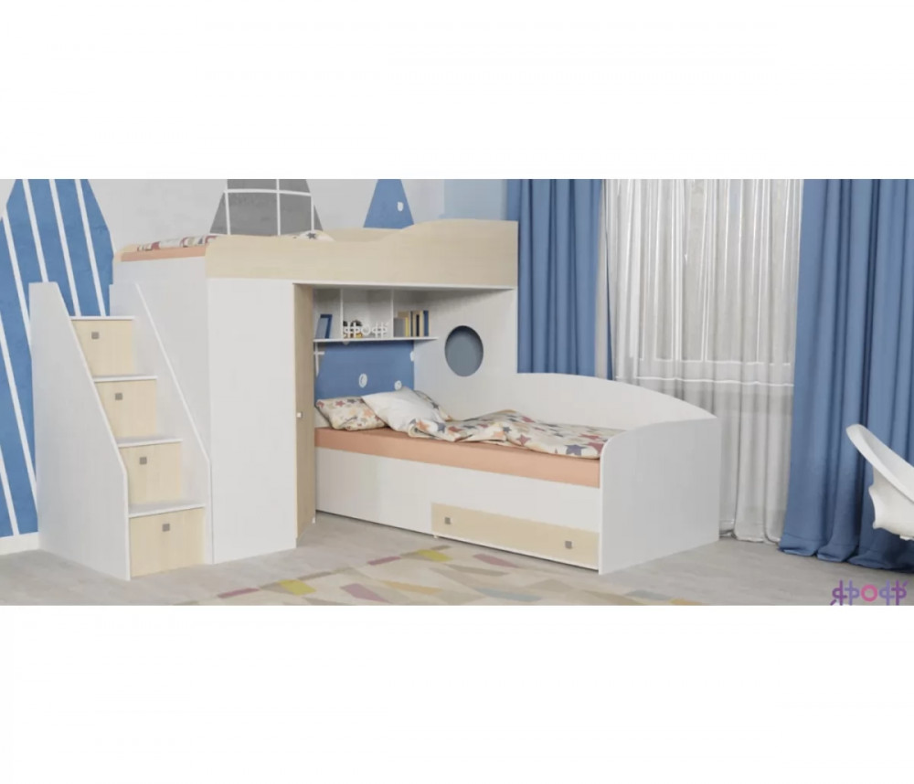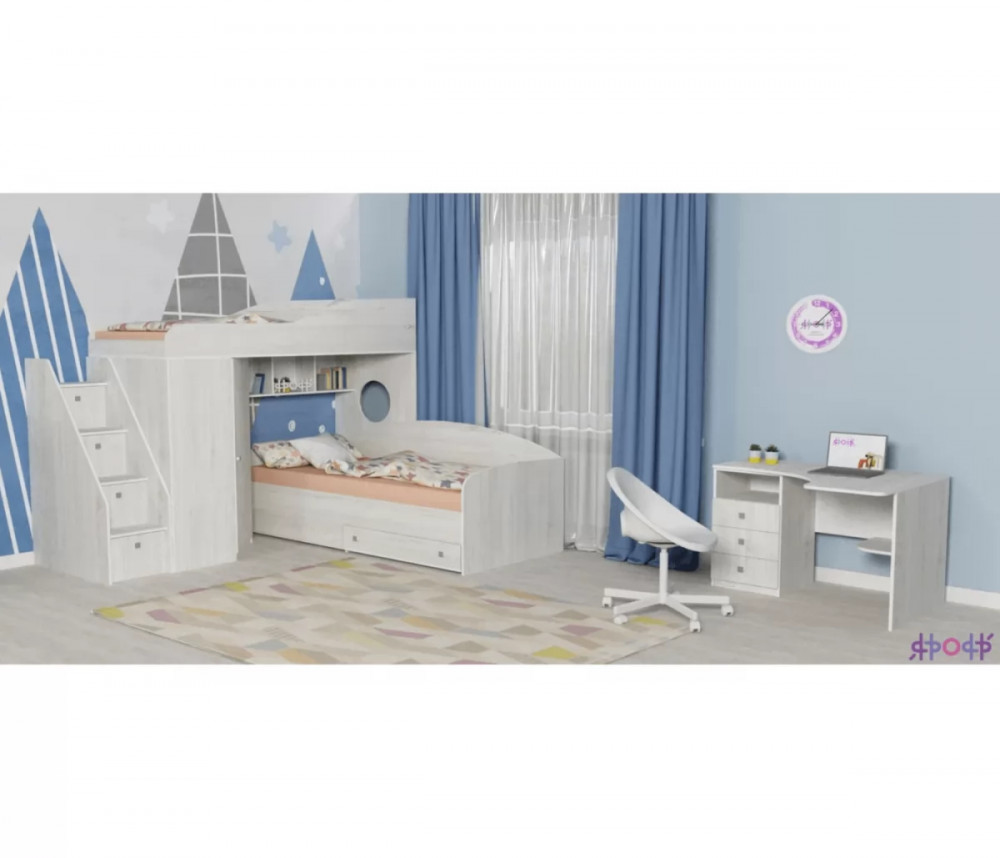 Кровать чердак Кадет 2 оснащен двумя спальными местами, лестницей в виде комода со ступенями в виде ящиков для хранения и угловым шкафом для одежды и белья. Данная модель подойдет как для детей младших классов, так и для детей более старшего возраста. Такая кровать поразит вас своей компактностью, вместительностью и практичностью.