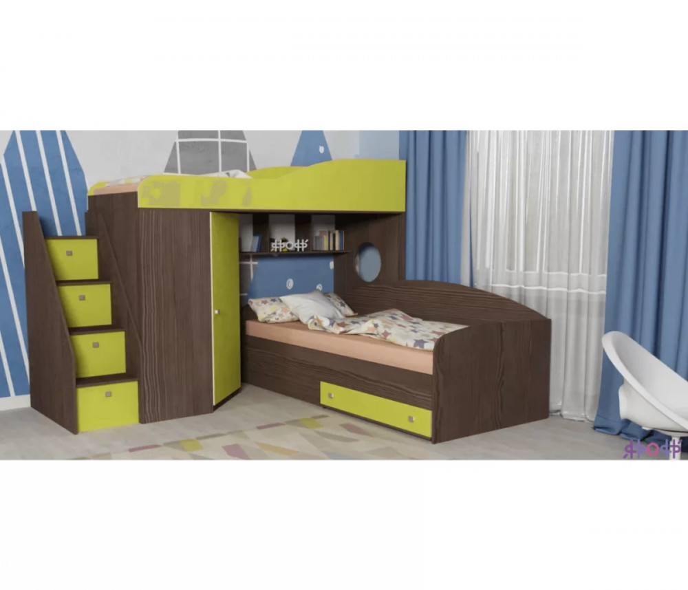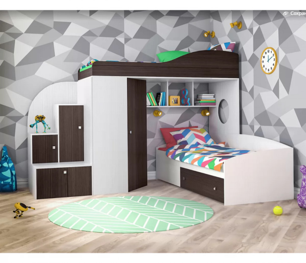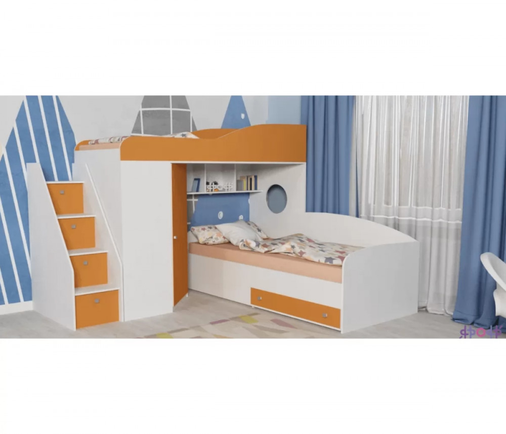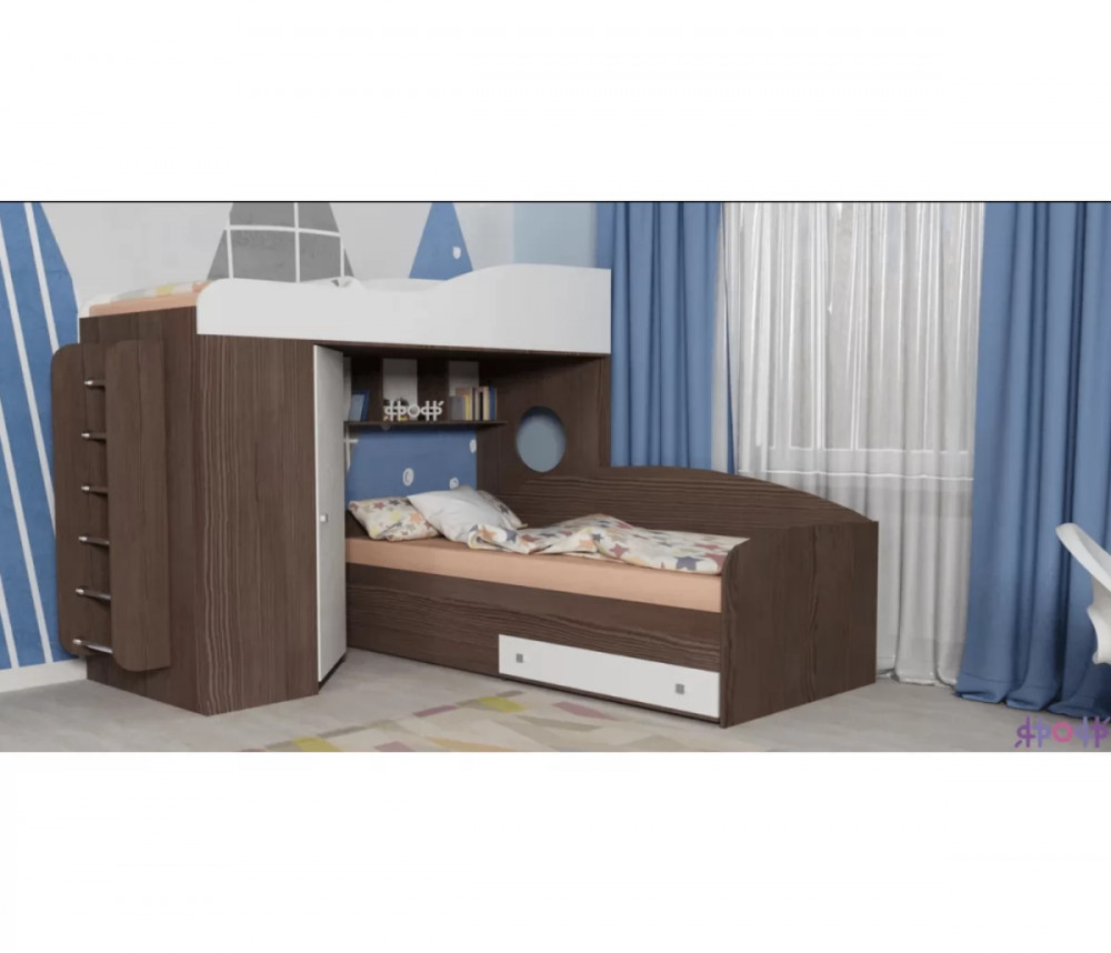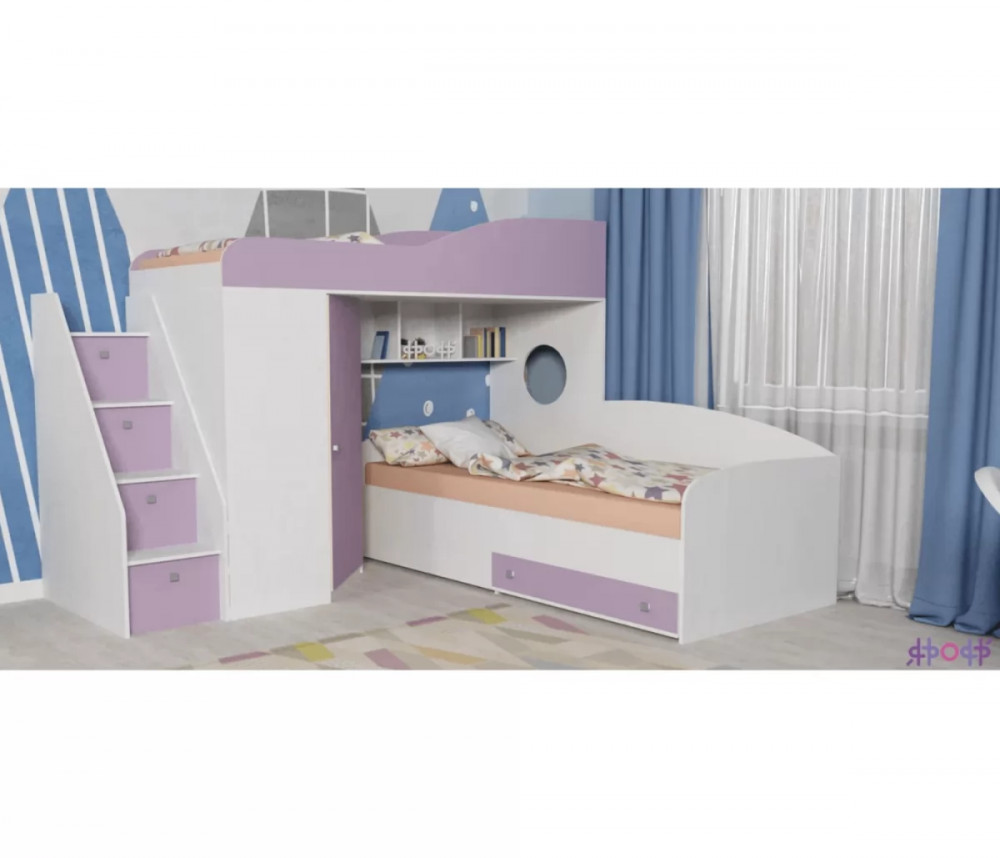 Кровать чердак Кадет 2 оснащен двумя спальными местами, лестницей в виде комода со ступенями в виде ящиков для хранения и угловым шкафом для одежды и белья. Данная модель подойдет как для детей младших классов, так и для детей более старшего возраста. Такая кровать поразит вас своей компактностью, вместительностью и практичностью.