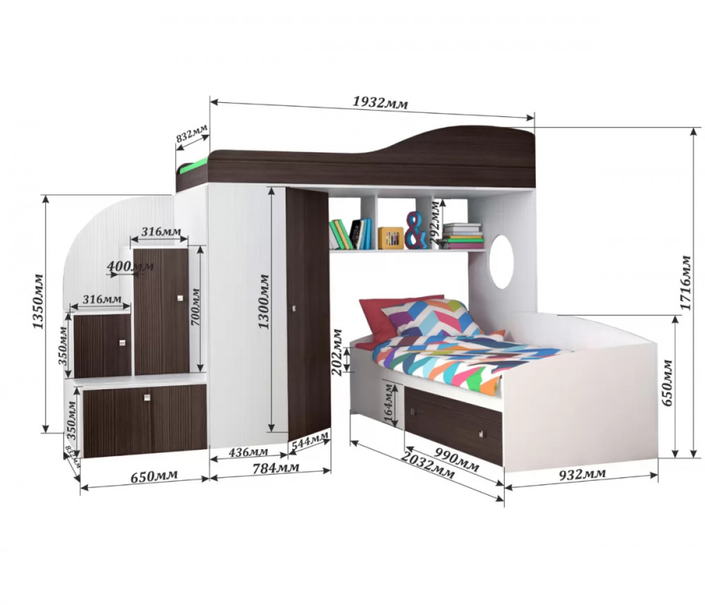 - Кровать нижняя ( спальное место 90 х 200 см), размеры (Д*Г*В): 2032*932*650 мм