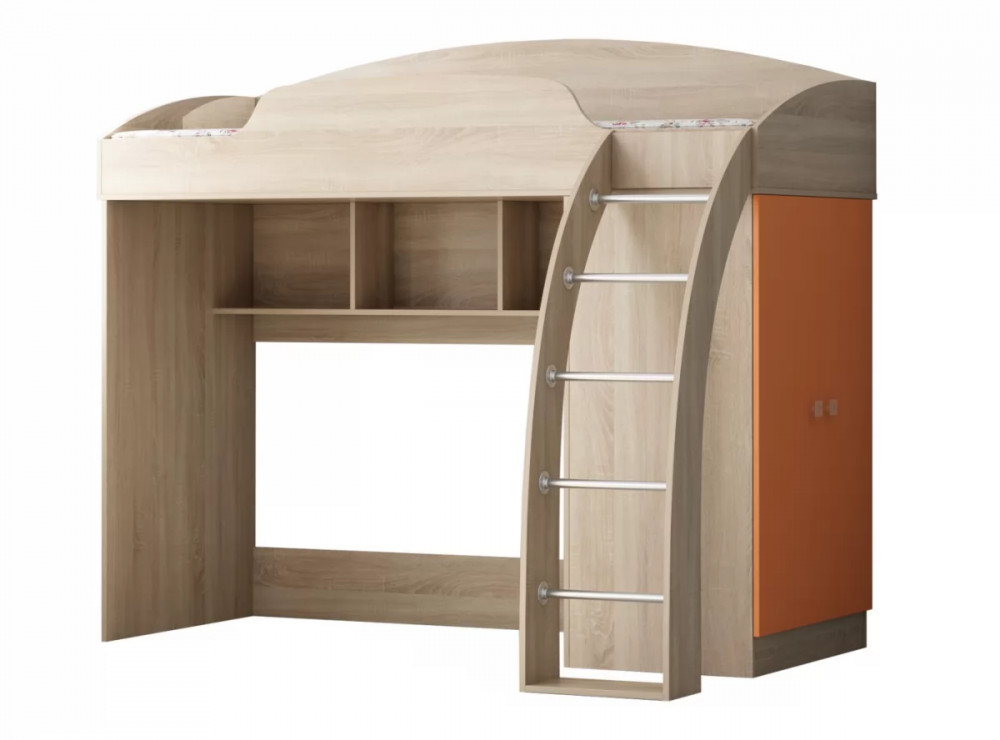 Верхняя кровать "Соня-1" имеет спальное место размером 80*190 см, комплектуется шкафом для одежды и других вещей в торцевой части, полками для учебных пособий или игрушек под спальным местом и устойчивой лестницей с металлическими ступенями. Такой уголок экономит пространство в детской комнате.