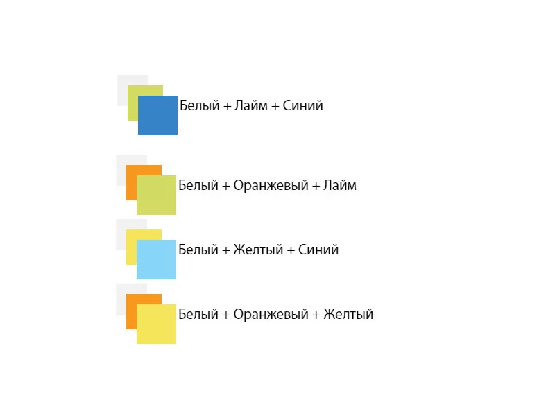 | Цвет | Белый + Оранжевый + Желтый, Белый + Желтый + Синий, Белый + Оранжевый + Лайм, Белый + Ярко-розовый + Светло-розовый, Белый + Лайм + Синий, Белый + Ярко-розовый + Синий |