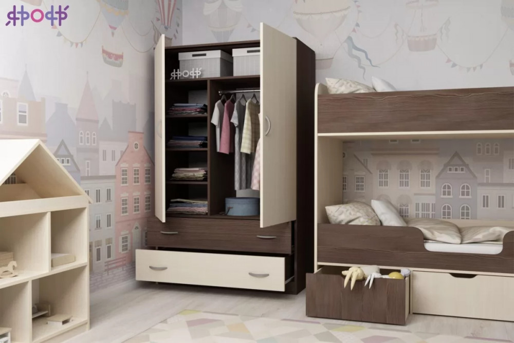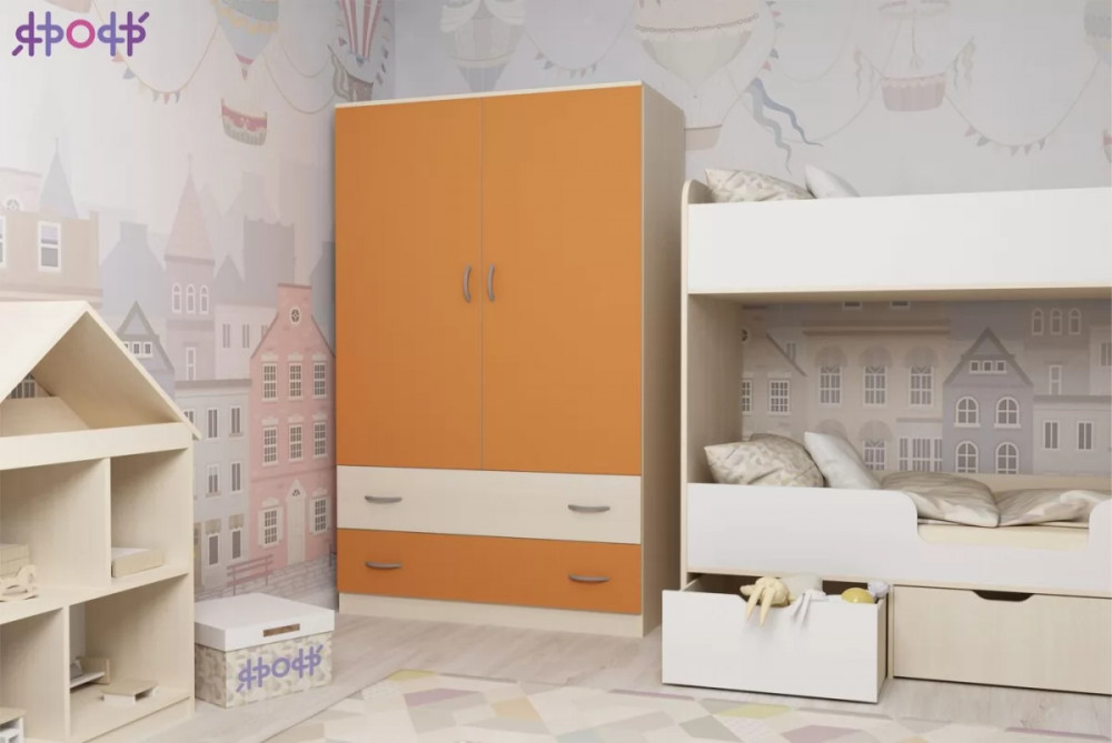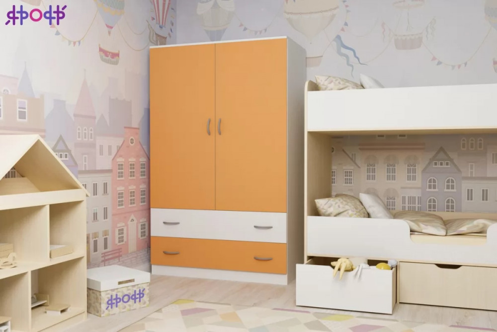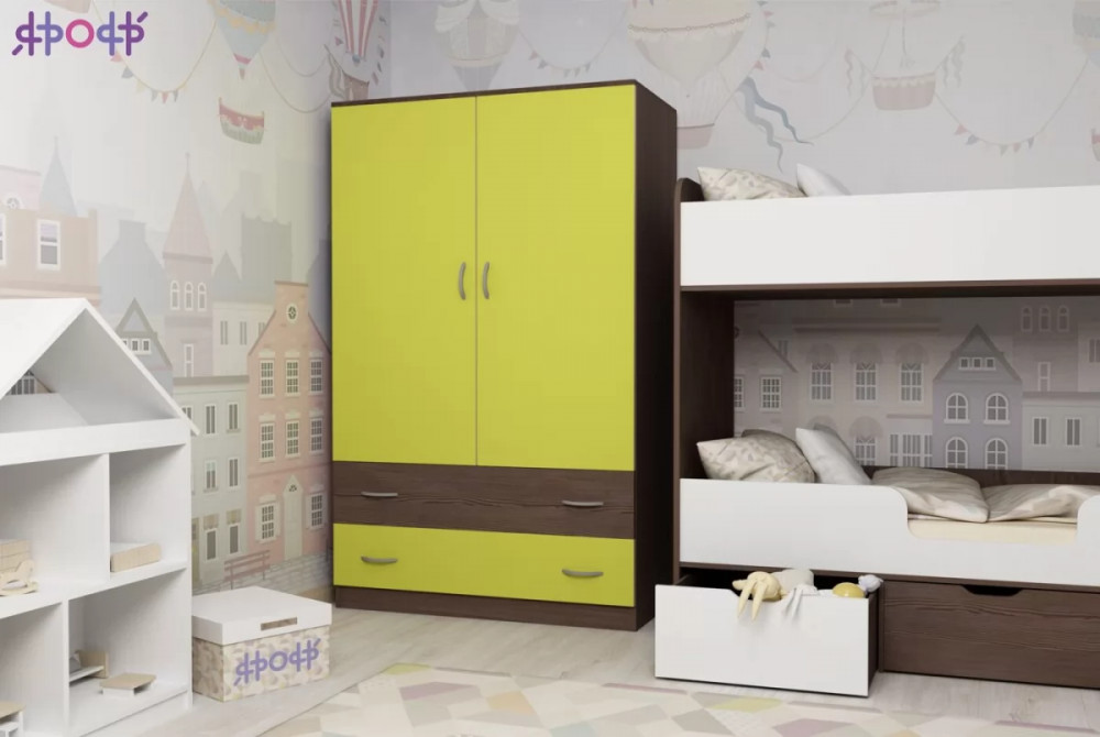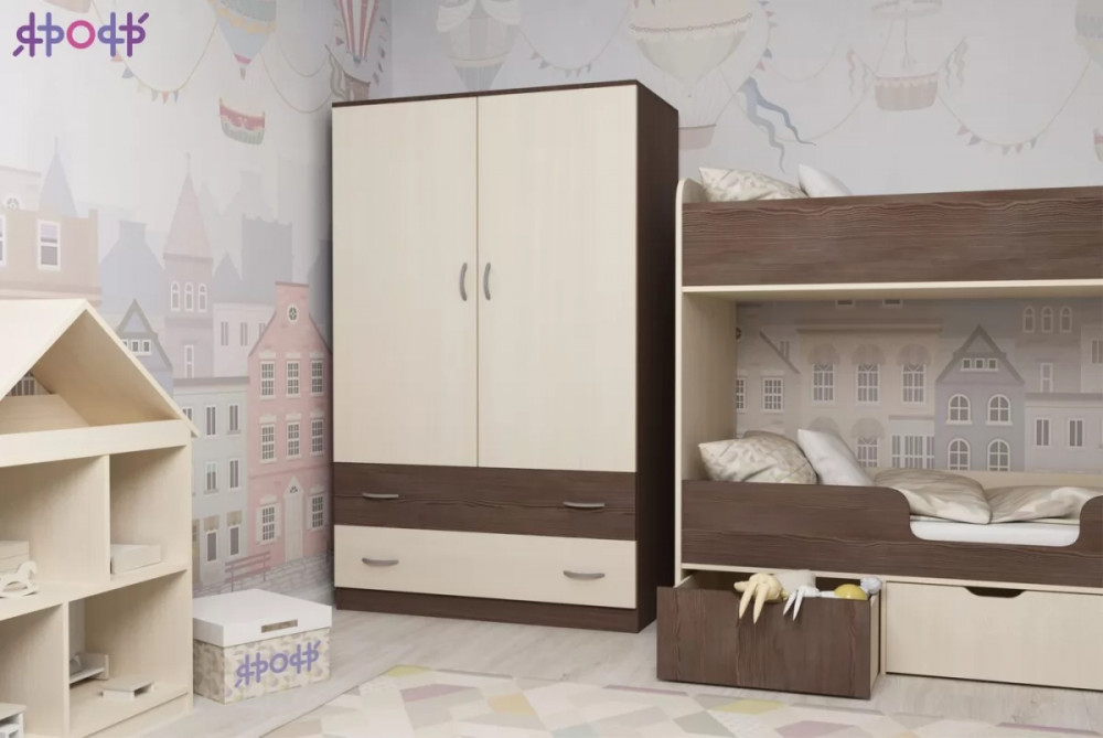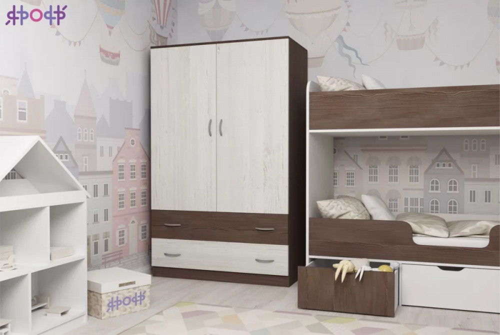 Классический двухстворчатый шкаф с распашными дверцами, который станет удачным дополнением любой комнаты. Модель может быть выполнена в нескольких цветах каркаса и фасада, причем цвет фасада может быть как повторять оттенок каркаса и иметь фактуру дерева, так и быть выполнен в ярком цвете. У двустворчатого шкафа удобная конструкция с распашными дверцами, вместительными полками и штангой для хранения вещей, а также двумя выдвижными ящиками снизу на роликовых направляющих.