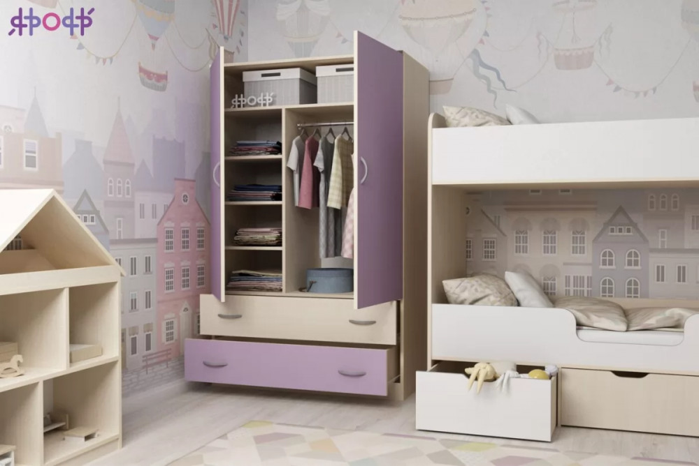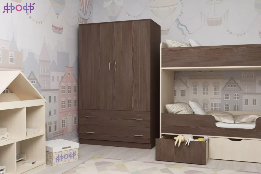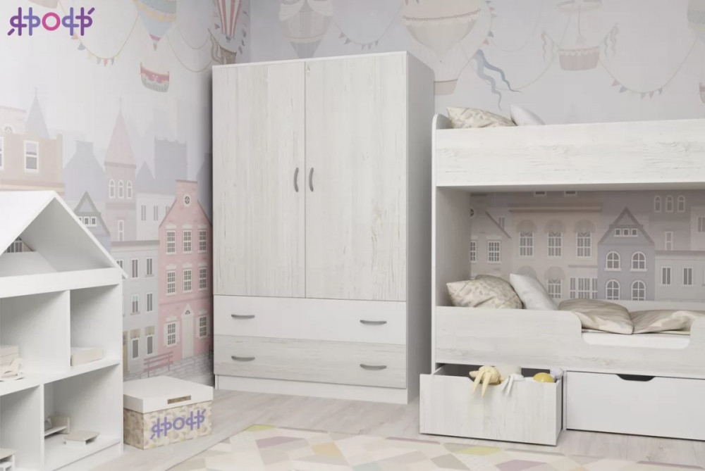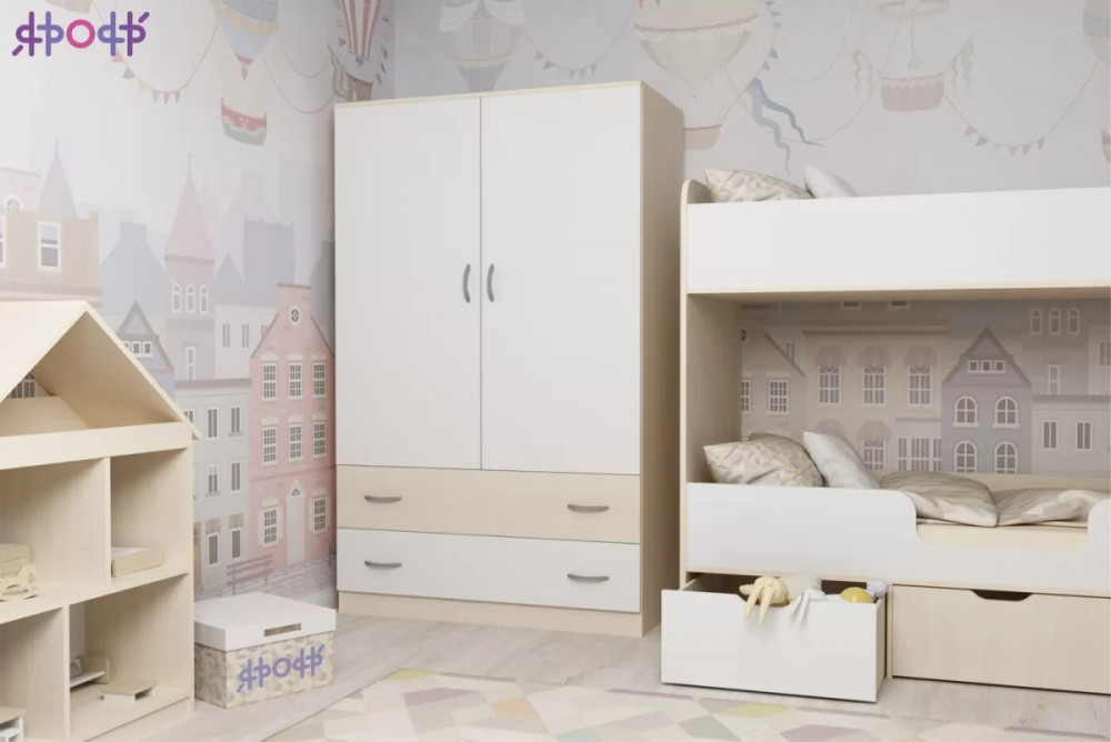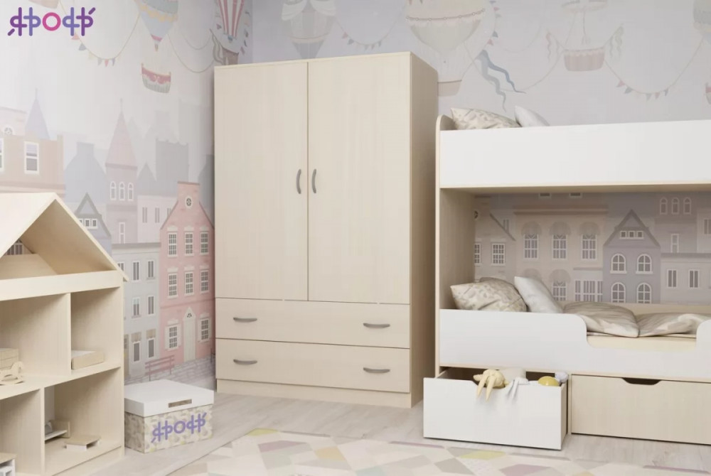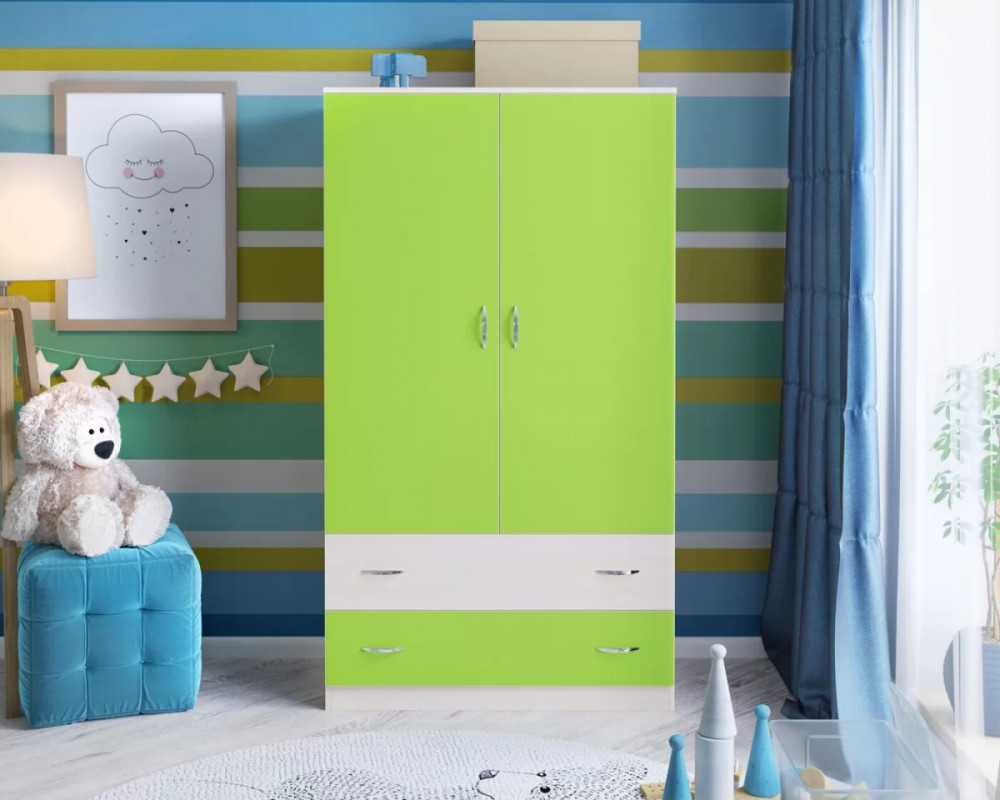 Классический двухстворчатый шкаф с распашными дверцами, который станет удачным дополнением любой комнаты. Модель может быть выполнена в нескольких цветах каркаса и фасада, причем цвет фасада может быть как повторять оттенок каркаса и иметь фактуру дерева, так и быть выполнен в ярком цвете. У двустворчатого шкафа удобная конструкция с распашными дверцами, вместительными полками и штангой для хранения вещей, а также двумя выдвижными ящиками снизу на роликовых направляющих.