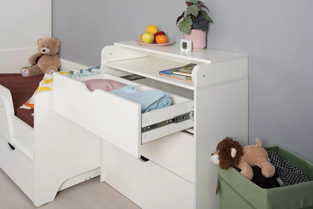Комод оснащён складным пеленальным столиком и тремя ящиками с шариковыми направляющими полного выдвижения.