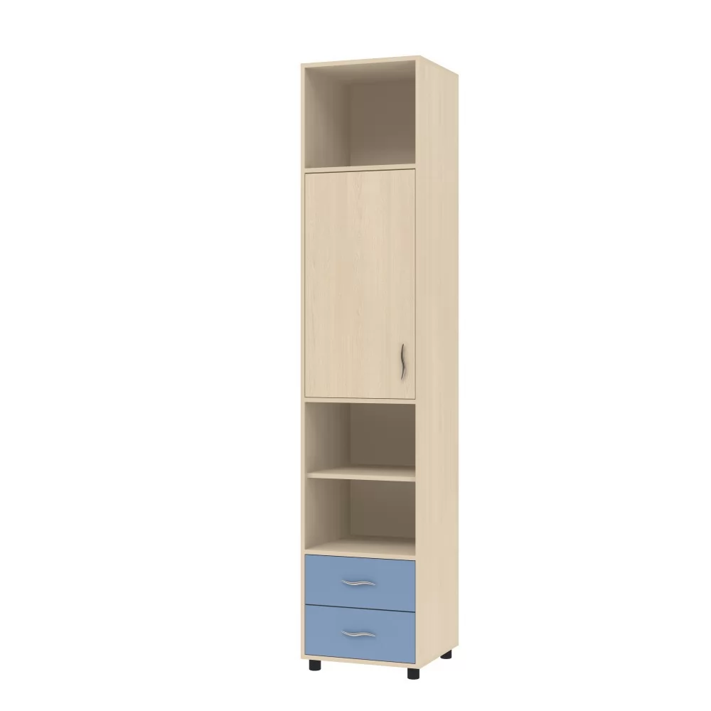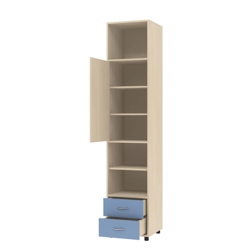 Шкаф станет прекрасным функциональным решением для хранения вещей в детской комнате. Этот предмет мебели включает в себя 6 вместительных полок, в том числе 3 закрытых и 3 открытых полки, а также 2 выдвижных ящика. Таким образом, размещать в вещи в нем очень удобно. Современный и компактный шкаф отлично впишется в любой интерьер. Шкаф можно собрать с открыванием двери как на правую сторону, так и на левую. Шкаф установлен на регулируемых опорах.