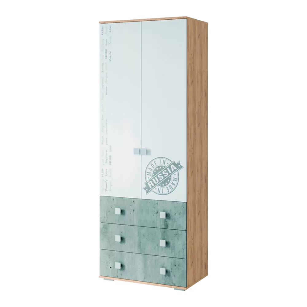 -модель состоит из трех выкатных ящиках на шариковых направляющих, нескольких полок и ниши со штангой для вещей на вешалках,