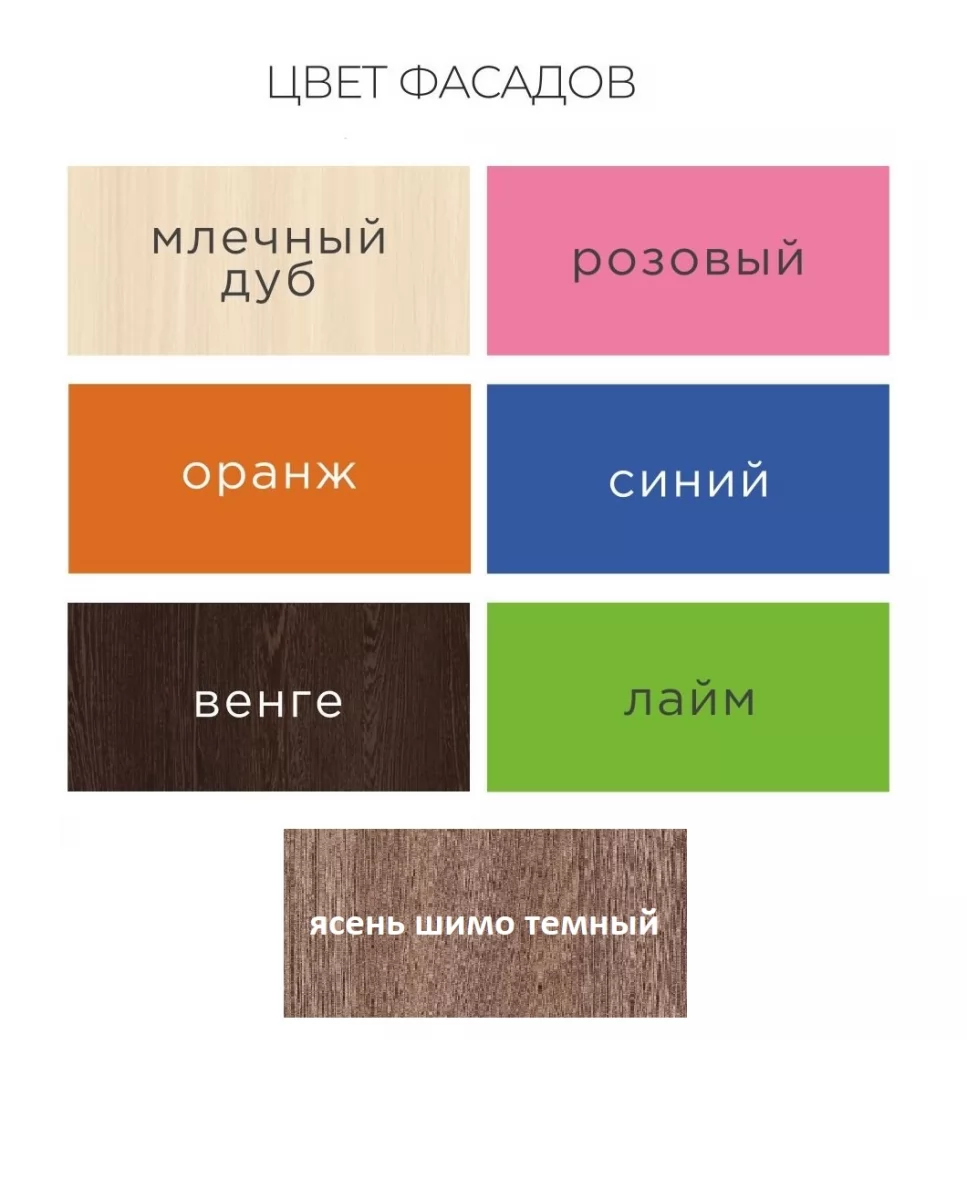 | Цвет(корпус/фасад) | Ясень шимо темный/Млечный дуб, Ясень шимо темный/Ясень шимо темный, Ясень шимо темный/Розовый, Ясень шимо темный/Венге, Ясень шимо темный/Синий, Ясень шимо темный/Оранж, Ясень шимо темный/Лайм, Белый/Млечный дуб, Белый/Ясень шимо темный, Белый/Розовый, Белый/Венге, Белый/Синий, Белый/Оранж, Белый/Лайм, Млечный дуб/Млечный дуб, Млечный дуб/Ясень шимо темный, Млечный дуб/Розовый, Млечный дуб/Венге, Млечный дуб/Синий, Млечный дуб/Оранж, Млечный дуб/Лайм |