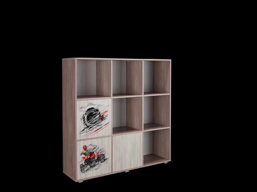 Стеллаж ДМ 9 - функциональный модуль, позволяющий упорядочить хранение вещей в детской комнате. Фасады, декорированные фотопечатью, можно разместить на стеллаже в любом порядке, создавая закрытые ниши в удобном месте.