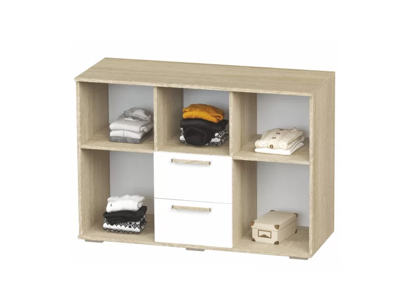 - модель выполнена из ЛДСП в цвете дуб сонома, а фасады двух выкатных ящиков имеют - белые,