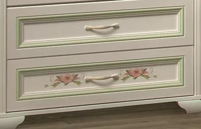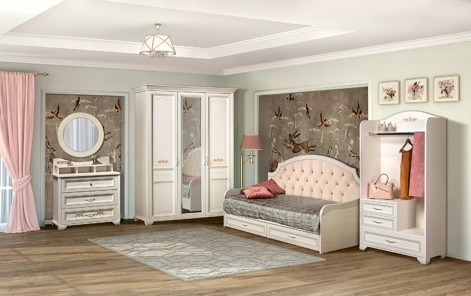 Детская «Флора» выполнена в классическом стиле и приятном светлом декоре «ясень белый». Изящный цветочный рисунок и серебристо-зеленая патина на светлом фоне придают мебели сдержанно-нарядный вид, благодаря чему комната будет выглядеть свежо и утонченно. Завершают внешний облик золотистые ручки с белой патиной в классическом стиле. Широкий модульный ряд позволяет создать комплекты под любой размер помещения и любой функционал. В этой детской есть оригинальные модули, которые интересным внешним видом добавят «изюминки» в интерьер.