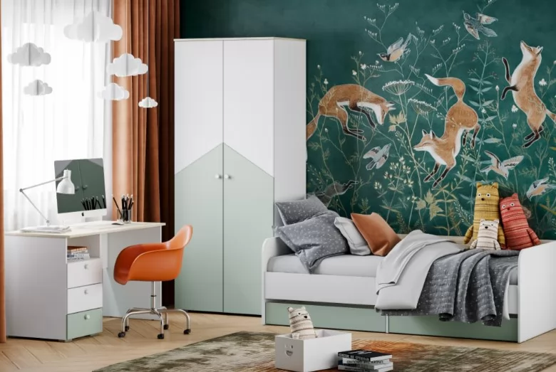 Коллекция «Банни» сочетает в себе актуальный дизайн и высокую функциональность. Практичная композиция в светлых тонах и цветными элементами фасадов станет отличным вариантом для меблировки современной молодежной комнаты. В данном комплекте: кровать с бельевыми ящиками, письменный стол с тремя выдвижными ящиками и шкаф с двумя полками и штангой для одежды. Максимально функциональные модули выполнят задачу эргономичного обустройства комнаты.