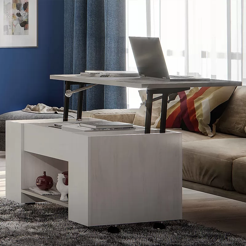 Журнальный столик в гостиной – предмет постоянного использования. Возможность трансформировать его в рабочий позволит сэкономить на покупке письменного стола и с удобством разместиться с ноутбуком дома. Стол из коллекции Леон шириной всего 900 мм. Он комплектуется колесными опорами, благодаря чему приобретает мобильность в передвижении. Столешница в декоре Ателье светлый изготовлена из ЛДСП толщиной 22 мм и облицована кромкой ПВХ 2 мм, что обеспечивает ее надежность и высокую износоустойчивость.