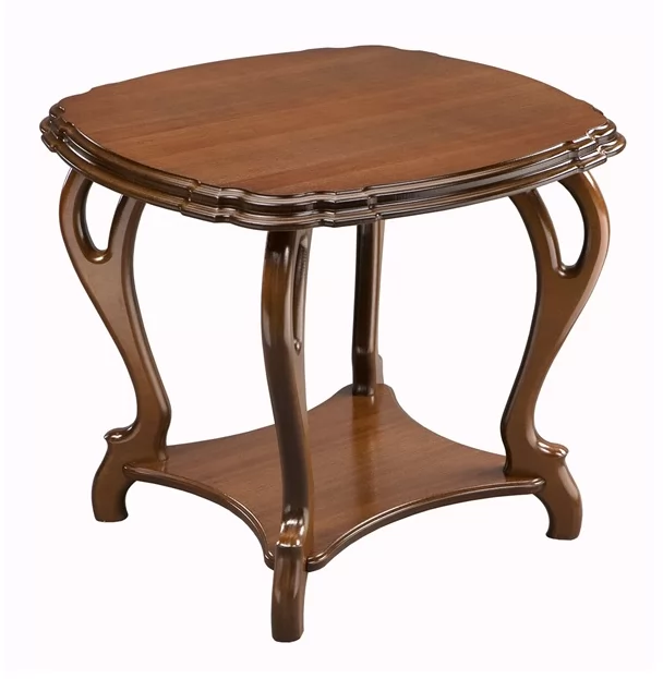Стол кофейный в винтажном стиле отлично впишется в интерьер классической гостиной. Отличительная особенность модели заключается в фигурной обработке края столешницы и изогнутых ножках. В нижней части конструкции имеется полочка, где можно хранить книги или газеты.
