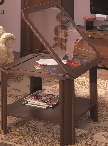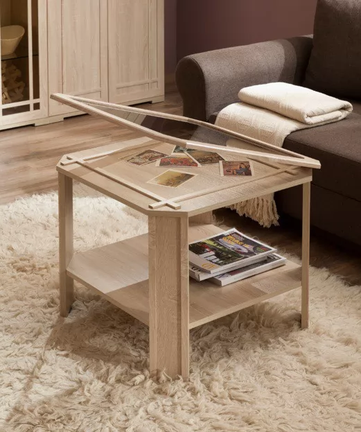 Маленький журнальный столик можно декорировать самостоятельно, благодаря откидной столешнице на шарнирных петлях. Например, сложить редкие открытки или фотографии любимых.