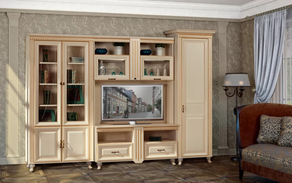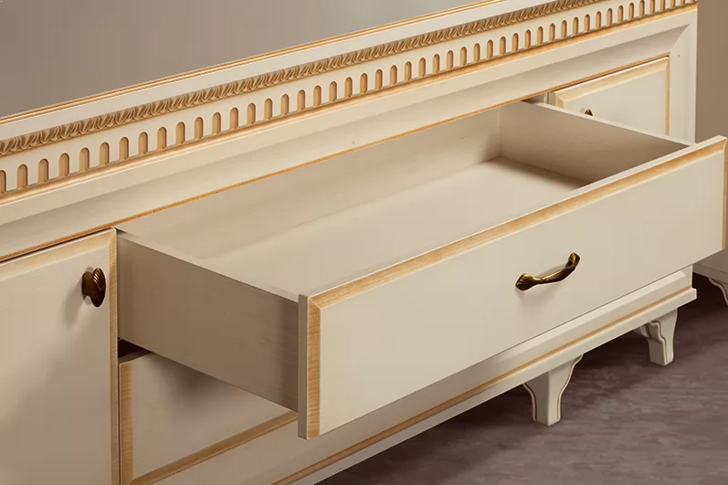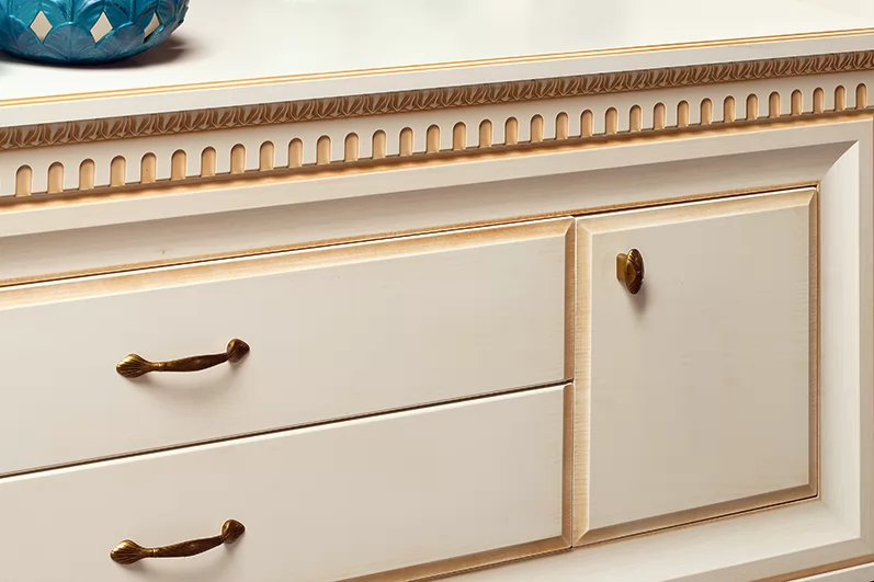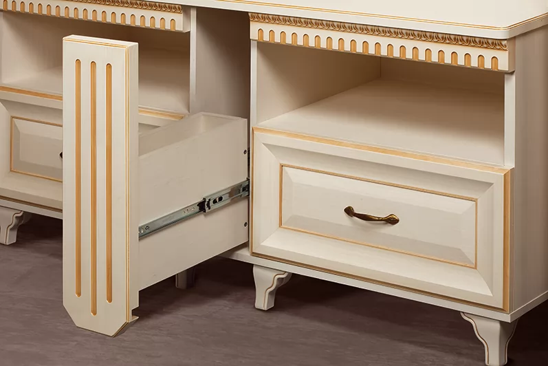 Классическая серия «Марлен» – выполнена в элегантном кремово-белом декоре с применением эффекта благородной патины. В дизайне мебели использованы классические приемы: рамочные фасады с объемной вставкой, декоративные фрезерованные накладки и карнизы, изящные резные ножки, ручки под полированную бронзу. В ящики с прочным дном из ДСП установлена надежная немецкая фурнитура «Hettich».