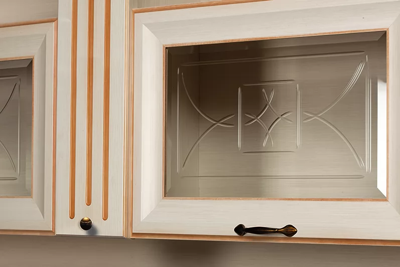 - Фасады: МДФ рамочные в финиш-пленке с эффектом патины, прозрачное стекло с фацетом и гравировкой, декор: «кремовый белый», патина