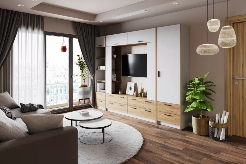 Изюминкой является функциональная стенка. Как правило, такая мебель не украшена крупным броским декором, зато имеет максимальное количество полочек и ящиков и сохраняет свободное