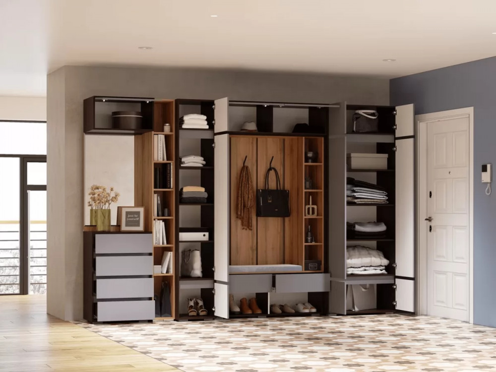 Прихожая – это обязательная составляющая любой квартиры или дома. Именно данное помещение создает первое впечатление о жильцах. Модульная прихожая «Прага» характеризуется в первую очередь функциональностью. Она достаточно вместительна для хранения различных вещей, обуви, одежды, сумок. Данное изделие выполнено в современном цветовом стиле, который отличается мобильностью, удобством и отличным функционалом. Вы можете собрать модульную прихожую под любое Ваше желание, если добавить антресоли общая высота прихожей составит 2,5 метра.