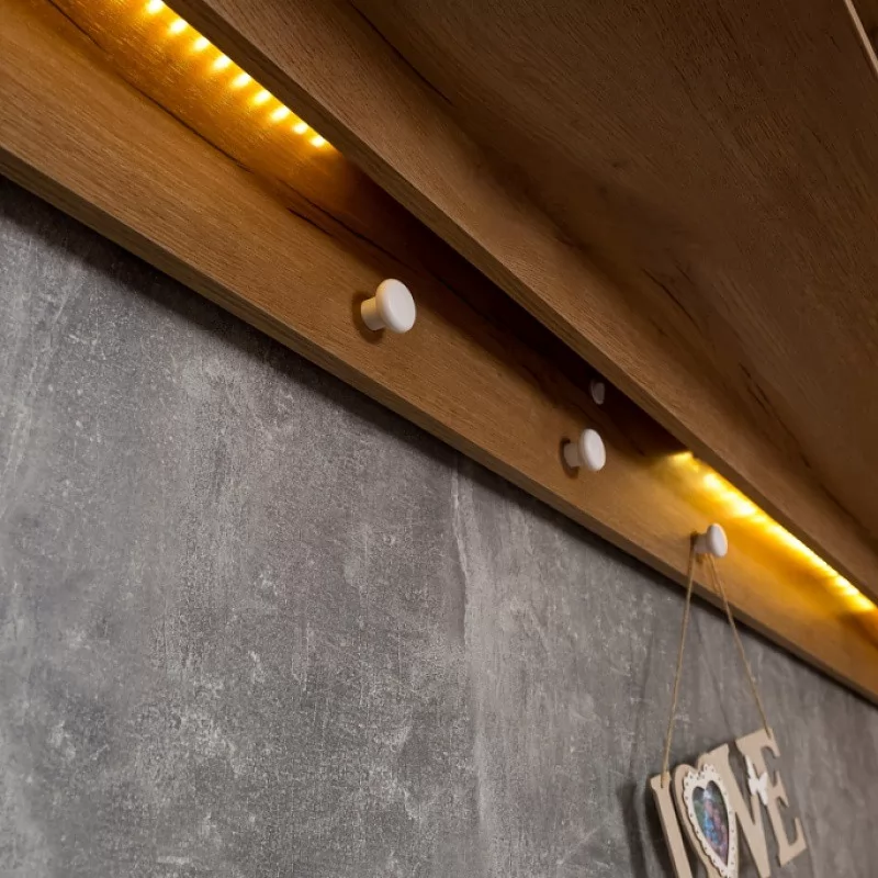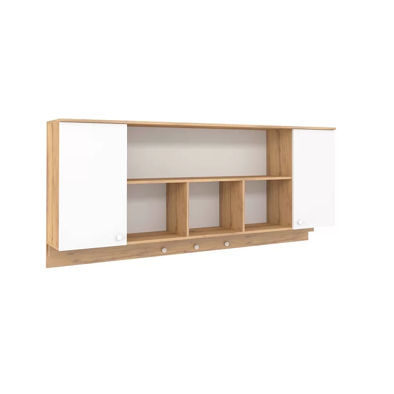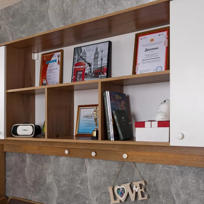 Навесные шкафы-мосты с функцией ночника привлекательны для детей и для поклонников оригинальных решений. Включается и выключается диодная подсветка ночника при помощи маленького аккуратного выключателя. Также 81 Шкаф навесной - очень практичное решение, он позволяет рационально использовать пространство над кроватью, объединяя в себе ниши, полочки и шкафчики за глухими фасадами. Белые ручки на пристенной панели играют роль крючков-гвоздиков для возможности декорирования зоны отдыха ребенка. Обращаем ваше внимание на то, что 81 Шкаф навесной обязательно крепится к стене на уголки и должен быть установлен и дополнительно закреплен между двумя высокими шкафами. Самостоятельное его размещение на стене не рекомендуется!