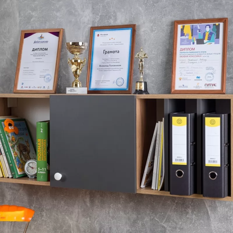 Навесной шкафчик с открытыми и закрытыми нишами, полками - удобный способ настенного хранения самых разных вещей. Универсальный модуль ЛОЙС 88 Шкаф навесной можно навесить на уголки как горизонтально, так и вертикально. В вертикальном положении рекомендуем использовать шкаф как функциональную надстройку для тетрадей и учебников над ЛОЙС 84 Стол письменный.