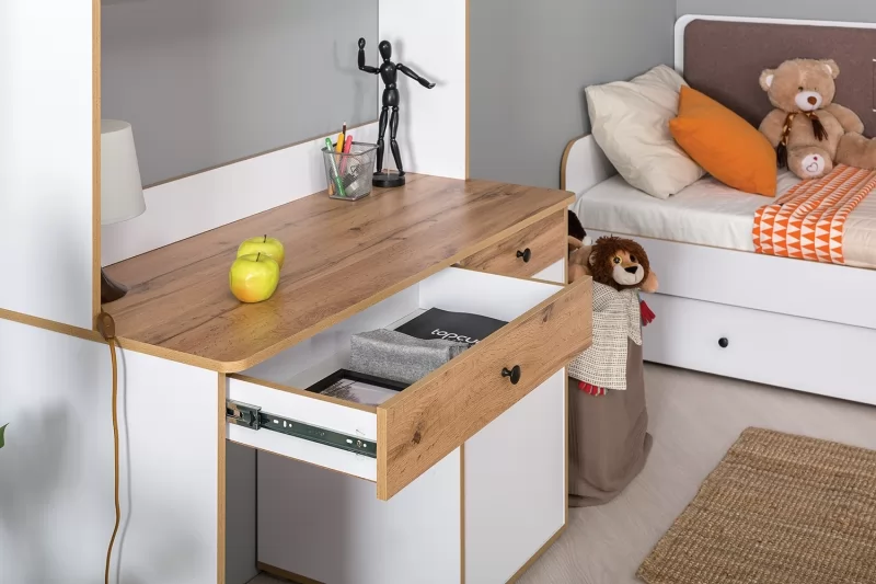 Светлая и аккуратная молодёжная мебель. Основой модульной системы является кровать-трансформер. Её столешница имеет постоянный горизонт, то есть при трансформации не нужно убирать вещи. Система хранения с подъёмными фасадами значительно расширяет функционал.