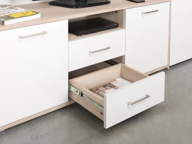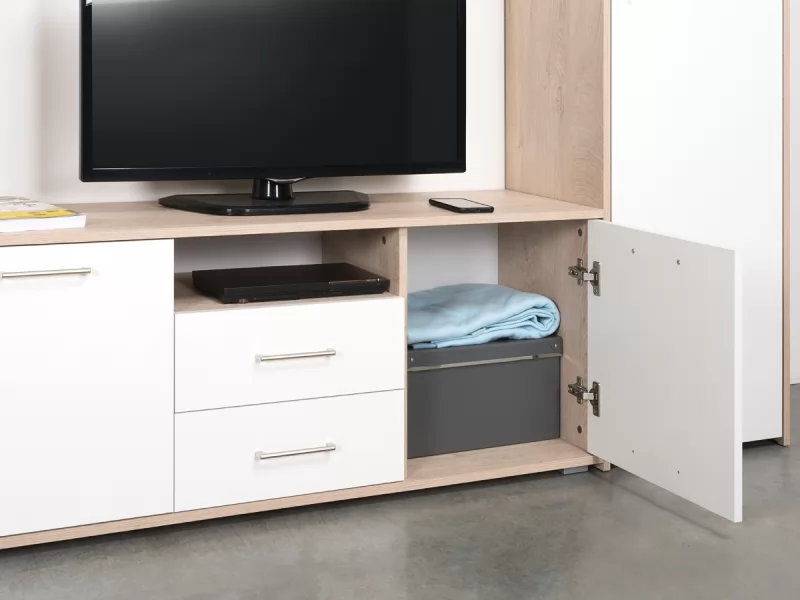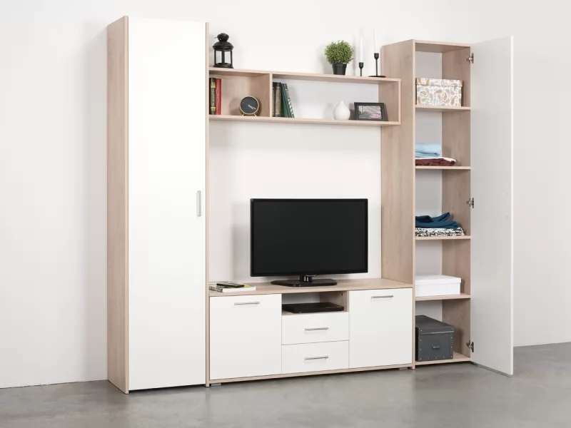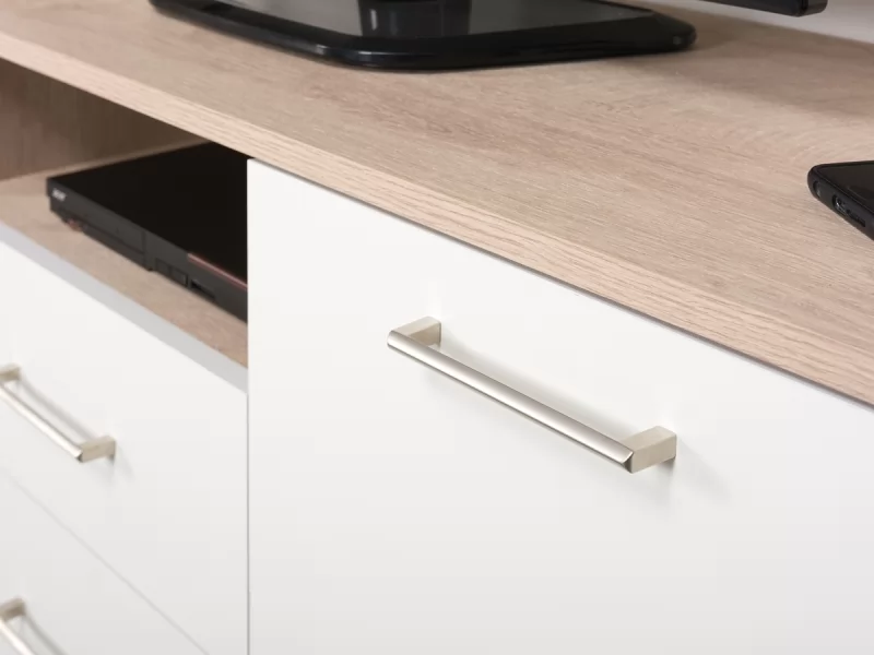 Гостиная "Альба 2" в стиле минимализм понравится тем, кому важна функциональность и спокойная цветовая гамма. В дизайне используется сочетание текстуры светлого дерева и матового белого цвета. В модулях увеличена полезная глубина и высота для большего объема хранения. На всех фасадах удобные и практичные ручки, выполненные из алюминия.