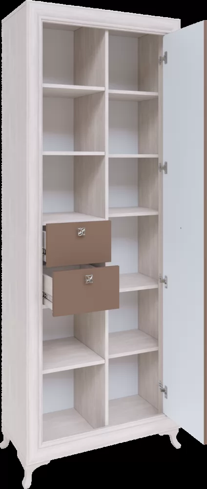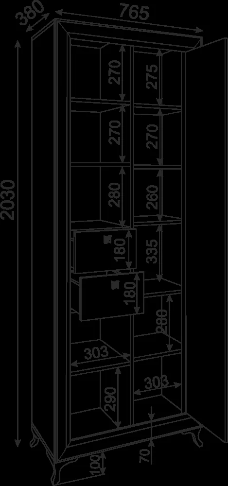 4. В открытой и закрытой секции по 3 съемные полки (в открытой - нижняя и две верхние; в закрытой - 2, 3 и 5 снизу).