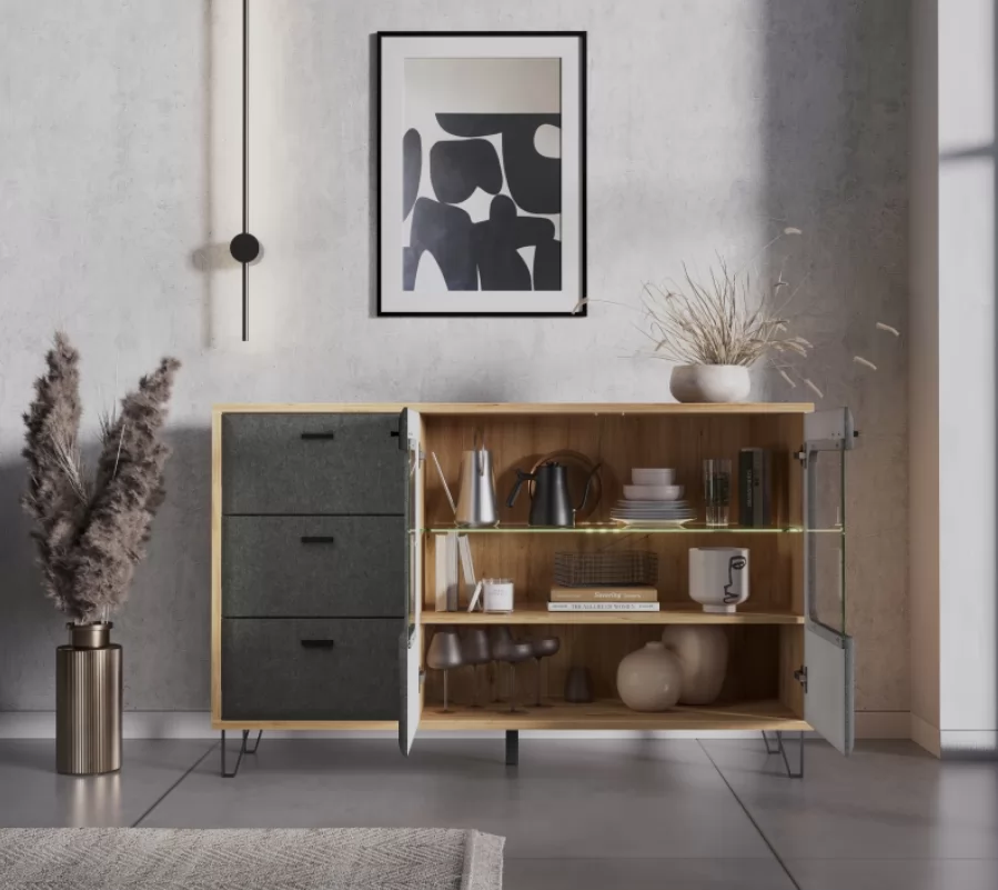 В левой части витрины расположены выдвижные ящики на шариковых направляющих. Они отлично подойдут для хранения текстиля, столовых приборов, аксессуаров или книг. Правая часть витрины имеет распашные дверцы со стеклянной вставкой. Внутри находятся вместительные полки, отлично подходящие для размещения фарфора, элементов коллекций или декора.