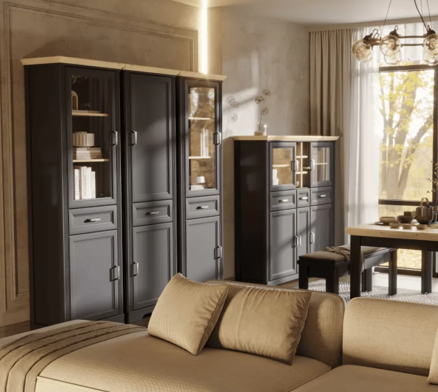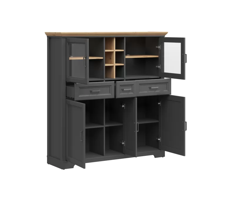 Витрина представляет собой современное прочтение классического серванта или горки для посуды. Конструкция имеет открытые ячейки для хранения вина или небольших предметов. Просторные ящики оснащены механизмом плавного закрытия. За распашными дверцами скрыты удобные полки. Центральная дверца может быть установлена как с левой, так и с правой стороны.