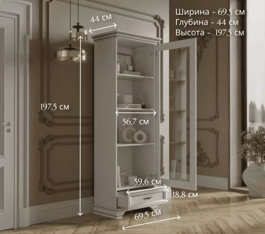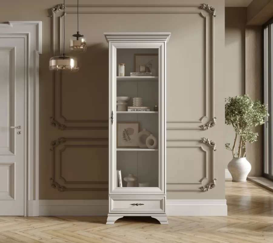 Сервант сочетает в себе элегантность и функциональность. За стеклянной дверцей расположены полки, где вы можете разместить посуду, декоративные предметы или книги. Внизу находится удобный выдвижной ящик, где удобно разместить мелочи или столовые приборы. Дверцу можно установить как с правой, так и с левой стороны.