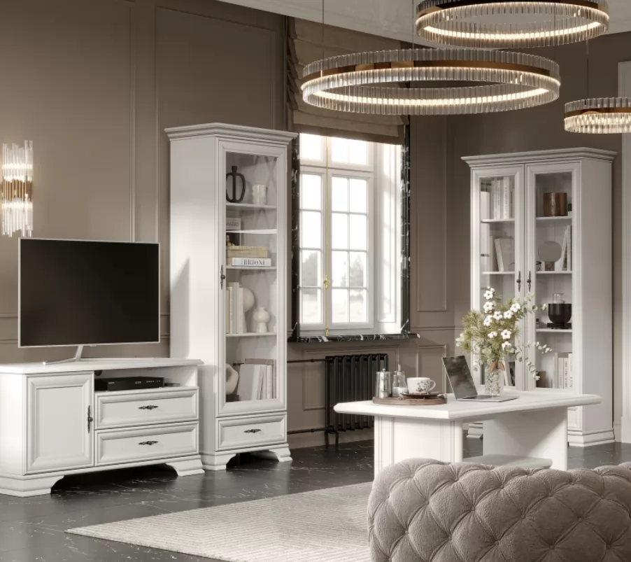 Модель имеет резные ножки, придающие ей изысканный вид. Витиеватые ручки подчеркивают классический стиль. Светлый фасад создает ощущение легкости и света.