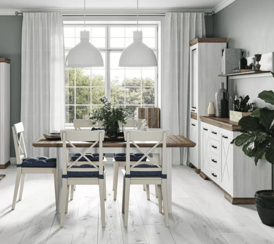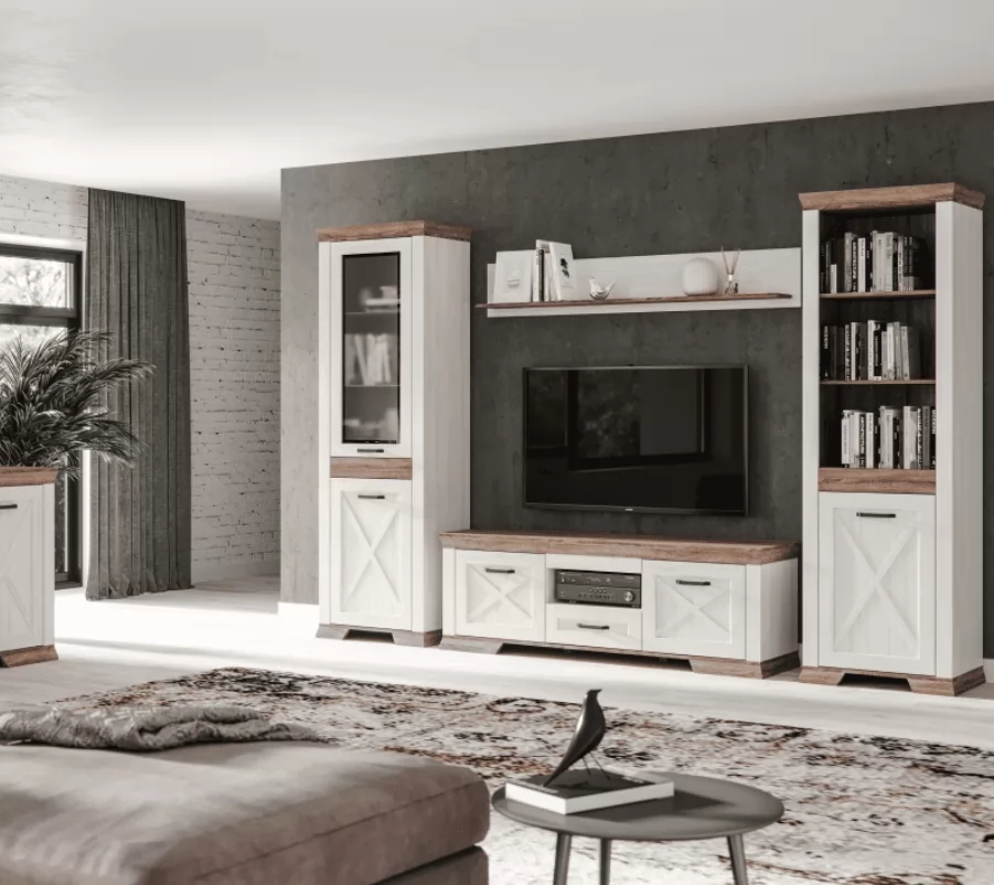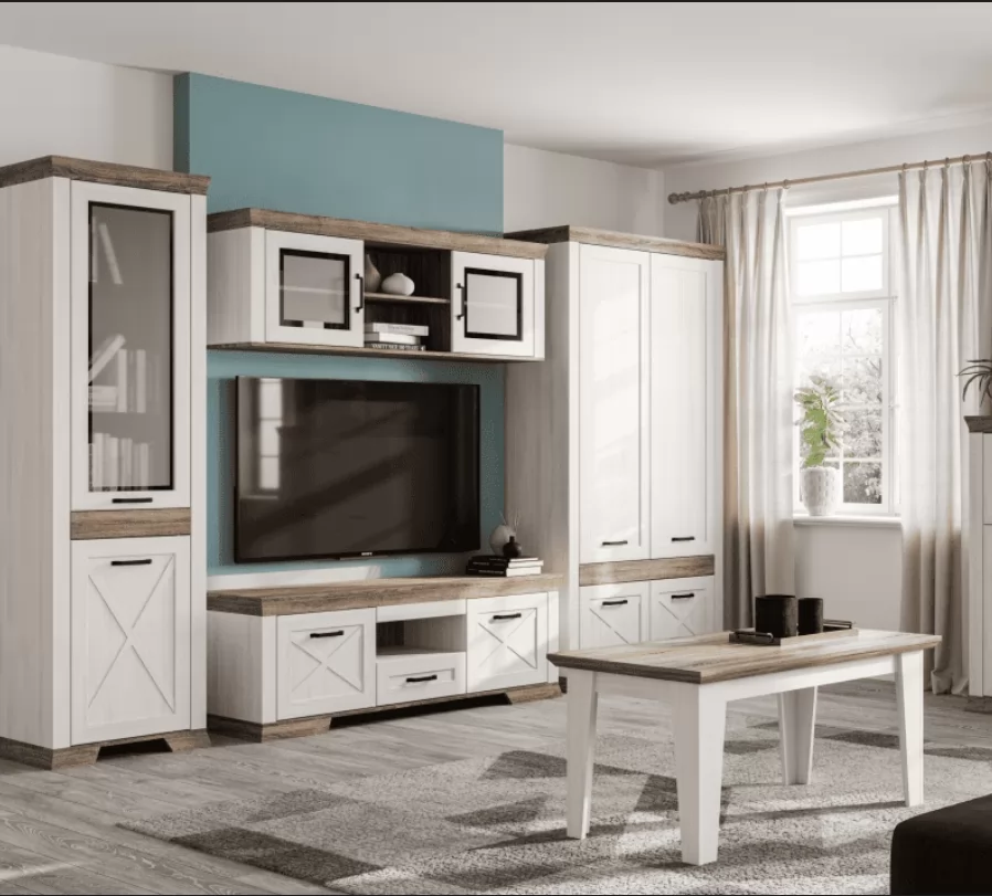 Стильная витрина имеет две распашные дверцы, предоставляющие удобный доступ к просторным полкам. Одна из дверей декорирована стеклянной вставкой. Эта деталь позволяет демонтировать элементы коллекций внутри защищая их от пыли и внешнего воздействия