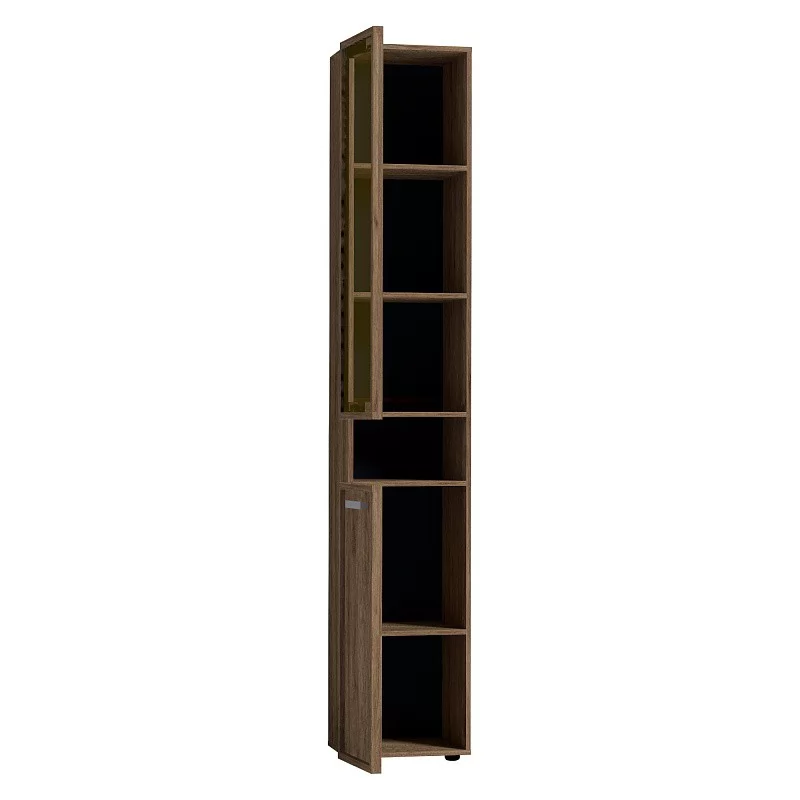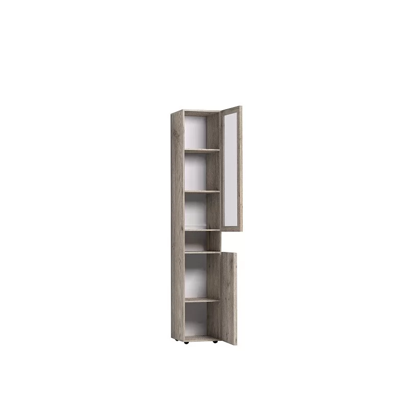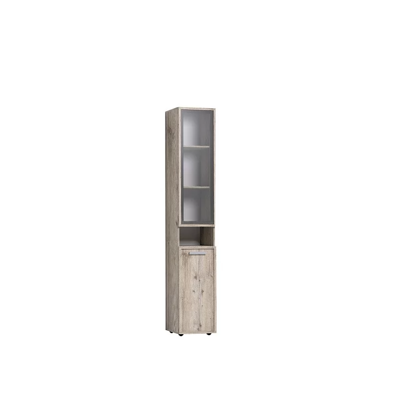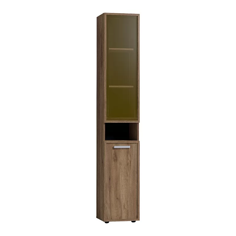 Высокий шкаф для хранения идеально подходит для комнаты подростков, в которой слишком много разнообразных и таких "нужных вещей". Верхний рамочный фасад с тонированным стеклом открывается за раму, нижний фасад Контур открывается за серую ручку из массива. Верхний и нижний фасады можно перенавесить на левую и на правую стороны.