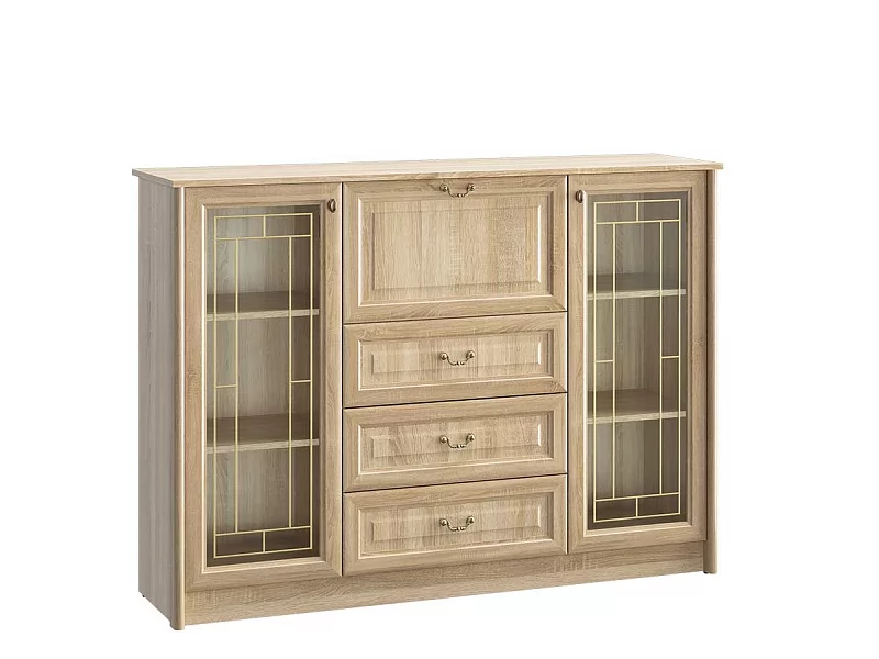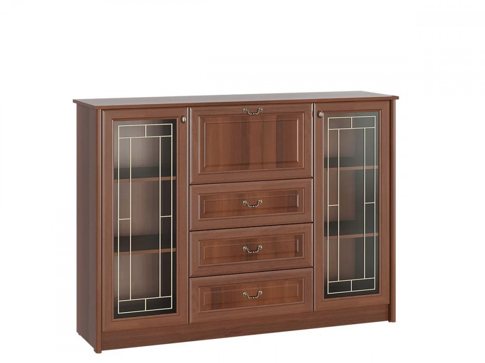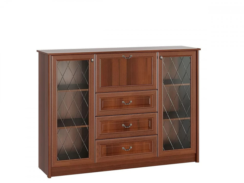 Витрина Янна (модуль ЯН-56) – стильный интерьерный предмет, который украсит любую гостиную или другую комнату, в нем вы можете разместить различные декоративные мелочи, книги и не только. Витрина ЯН-56 является частью модульной системы Янна, но вы можете использовать ее также отдельно от программы, в качестве самостоятельного предмета меблировки. У витрины Янна (модуль ЯН-56) с обеих сторон – небольшие шкафчики с полками и стеклянными дверцами, которые и создают эффект витрины, а посередине расположены полка с откидной дверцей и три выдвижных, вместительных ящика. Классический стиль исполнения, лаконичность линий и нейтральный оттенок позволяет ей и другим модулям системы органично вписаться в любое интерьерное решение, в малогабаритную или просторную квартиру