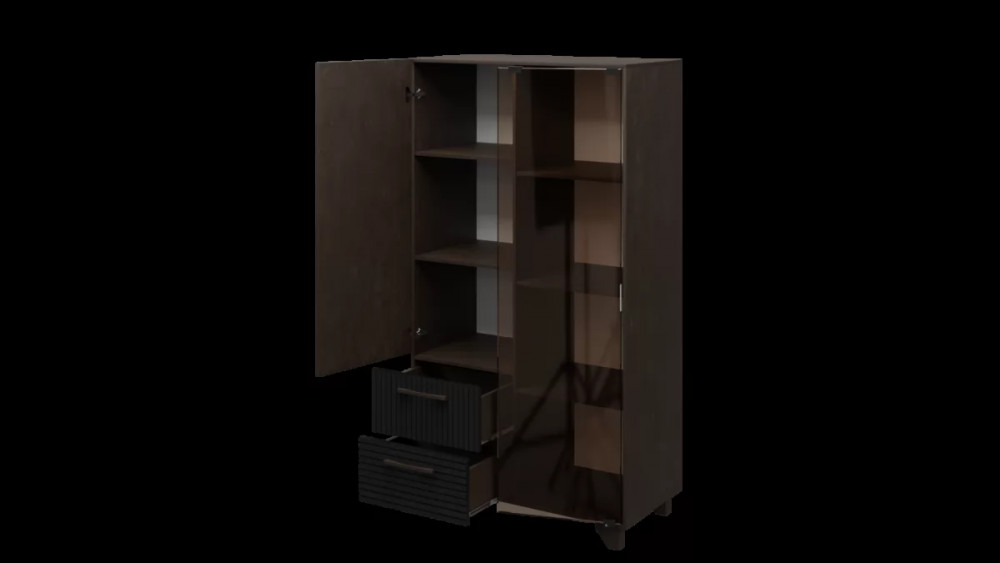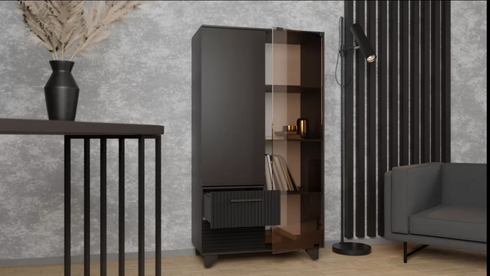 Стеллаж со стеклом — это практичное и дизайнерское решение для гостиной. Стеллаж имеет семь полок и два ящика. Ящики оснащены шариковыми направляющими полного выдвижения. Створки выполнены из ЛДСП и стекла, что позволяет хранить как необходимые предметы, так и предметы декора. Створки крепятся на петли с доводчиками для плавности хода. Конструкцией предусмотрен механизм открывания створок «push-to-open». Ручки ящиков из натурального массива дуба. Опоры изделия выполнены из массива дерева и имеют регулировку по высоте. Сочетание расцветки фасадов ящика и корпуса модели поможет подобрать идеальный вариант к обстановке помещения.