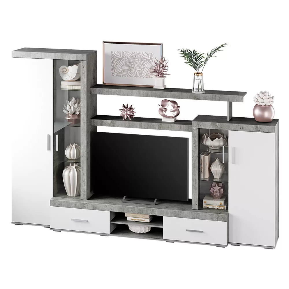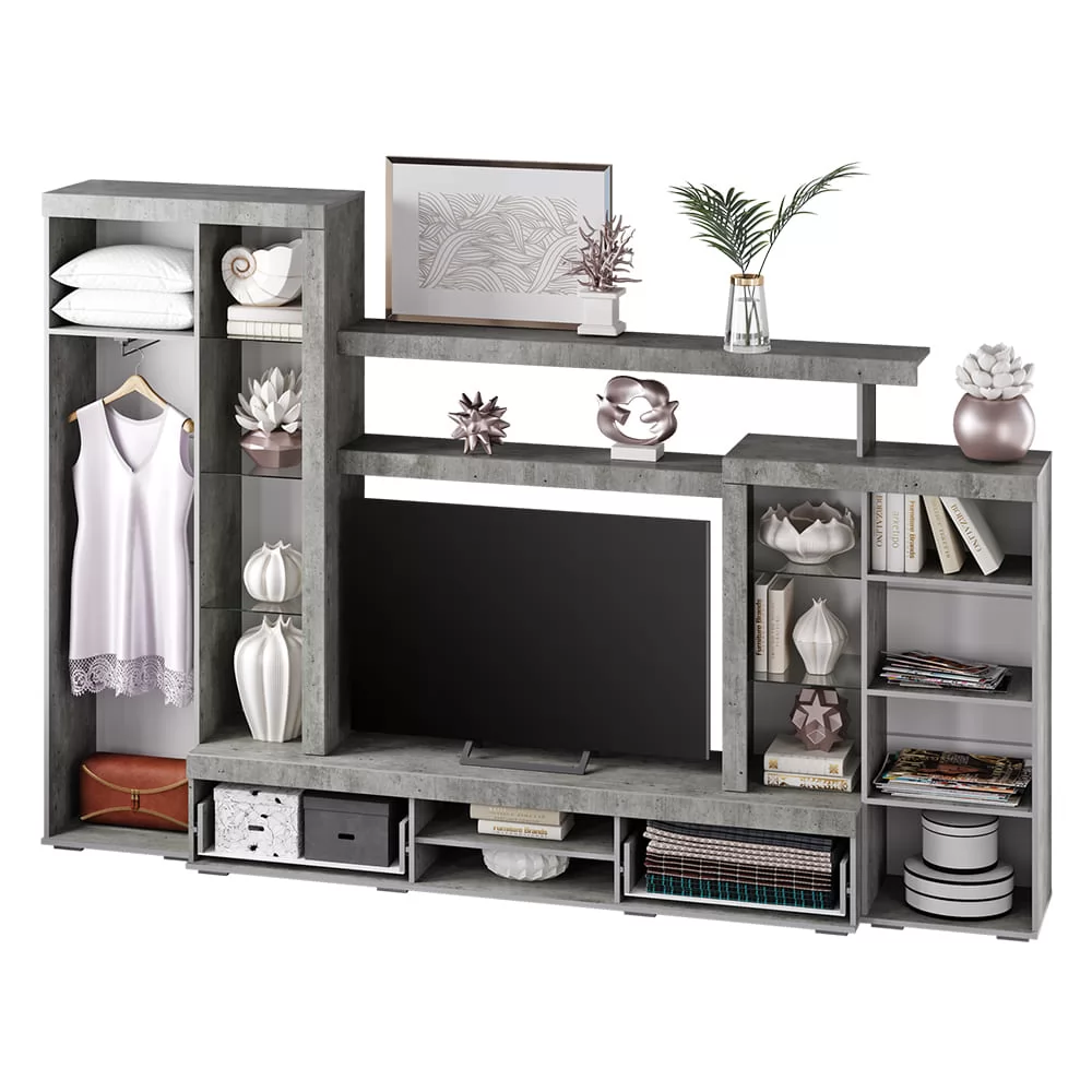 Цвет бетон корпуса в комбинации с белыми фасадами и вставками из стекла придают гостиной Интсайл легкости. Два распашных шкафа, в один из которых встроена хромированная штанга, позволят разместить личные вещи и предметы гардероба. На нескольких открытых полках вы сможете хранить сувениры, фотографии или предметы декора.