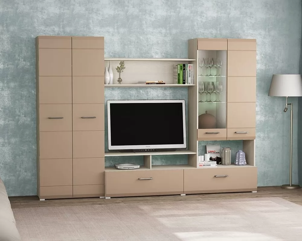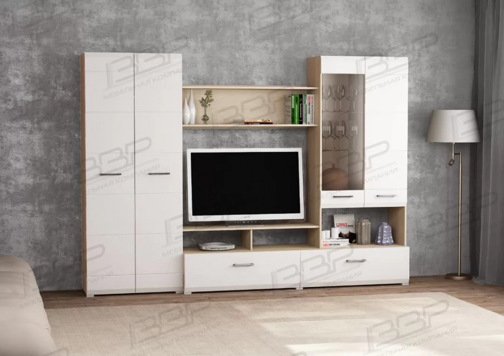 Гостиная изготавливается в цветах ясень шимо светлый / белый глянец. Корпус гостиной изготавливается из ДСП, а фасады из МДФ с глянцевым покрытием.