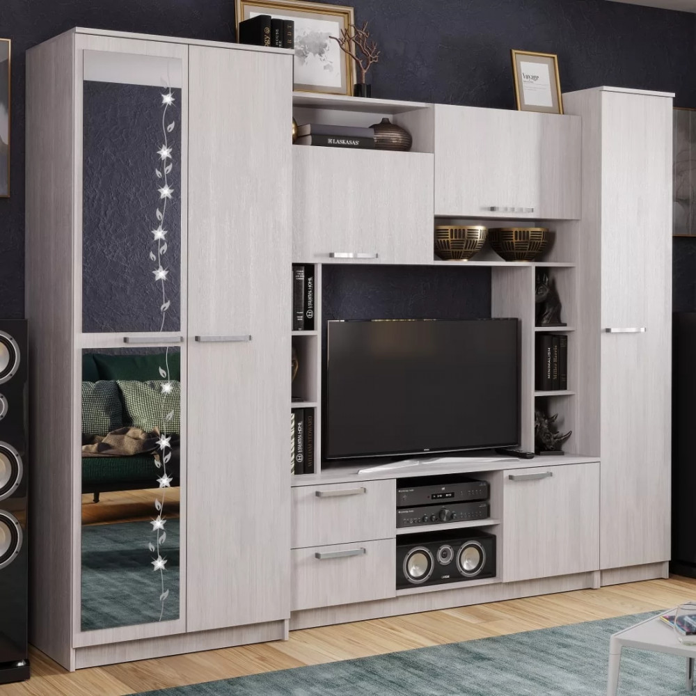 Гостиная «Флора» невероятно вместительный вариант. В ней вы сможете расположить телевизор, всю необходимую аудиотехнику, а верхние и нижние ящики прекрасно подойдут для документов и личных вещей. Кроме того, модель гостиной Флора имеет два полноценных шкафа, один из которых двустворчатый и оснащен штангой для вешалок с вашей одеждой.