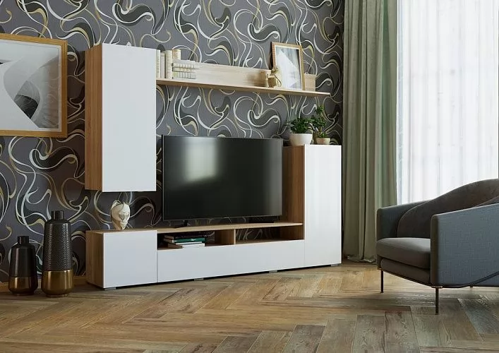 Гостиная "МИЯ" (ш2130*г346*в1680мм), ЛДСП дуб сонома/белый глянец в Тюмени